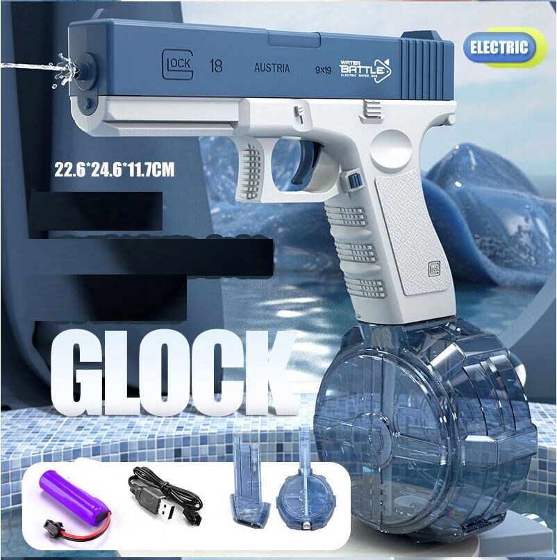 Pistolet à eau électrique avec 2 réserves d'eau. Une petite réserve (pistolet plus léger) et une plus grande réserve (pistolet un peu plus lourd).