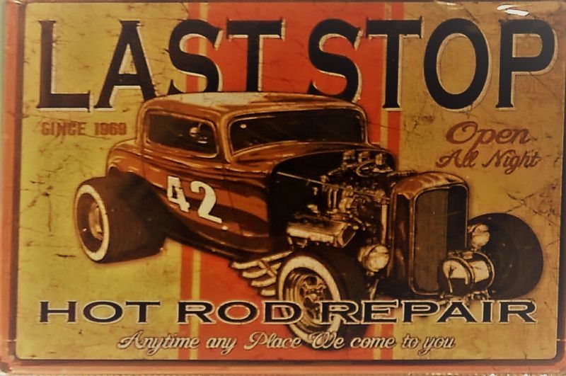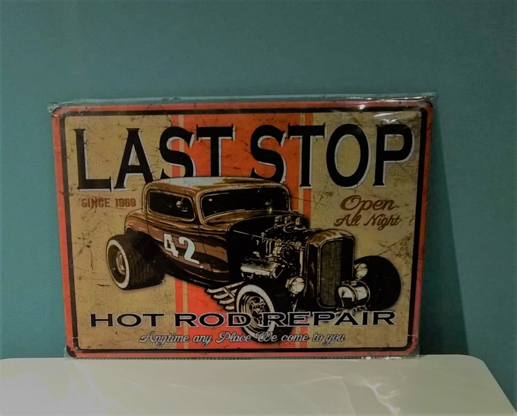 Plaque métal déco rétro automobile Last Stop. Plaque métal et étain neuve sous blister transparent avec 4 trous aux 4 coins pour une accroche au mur.