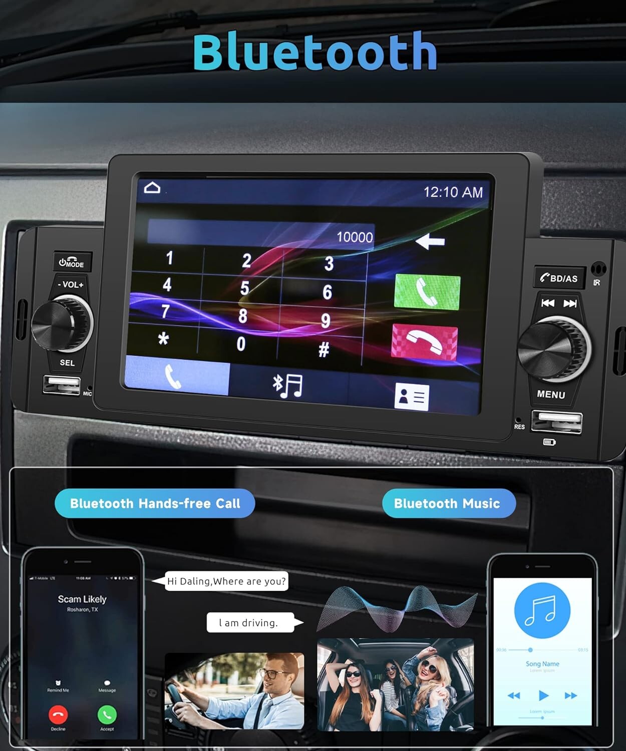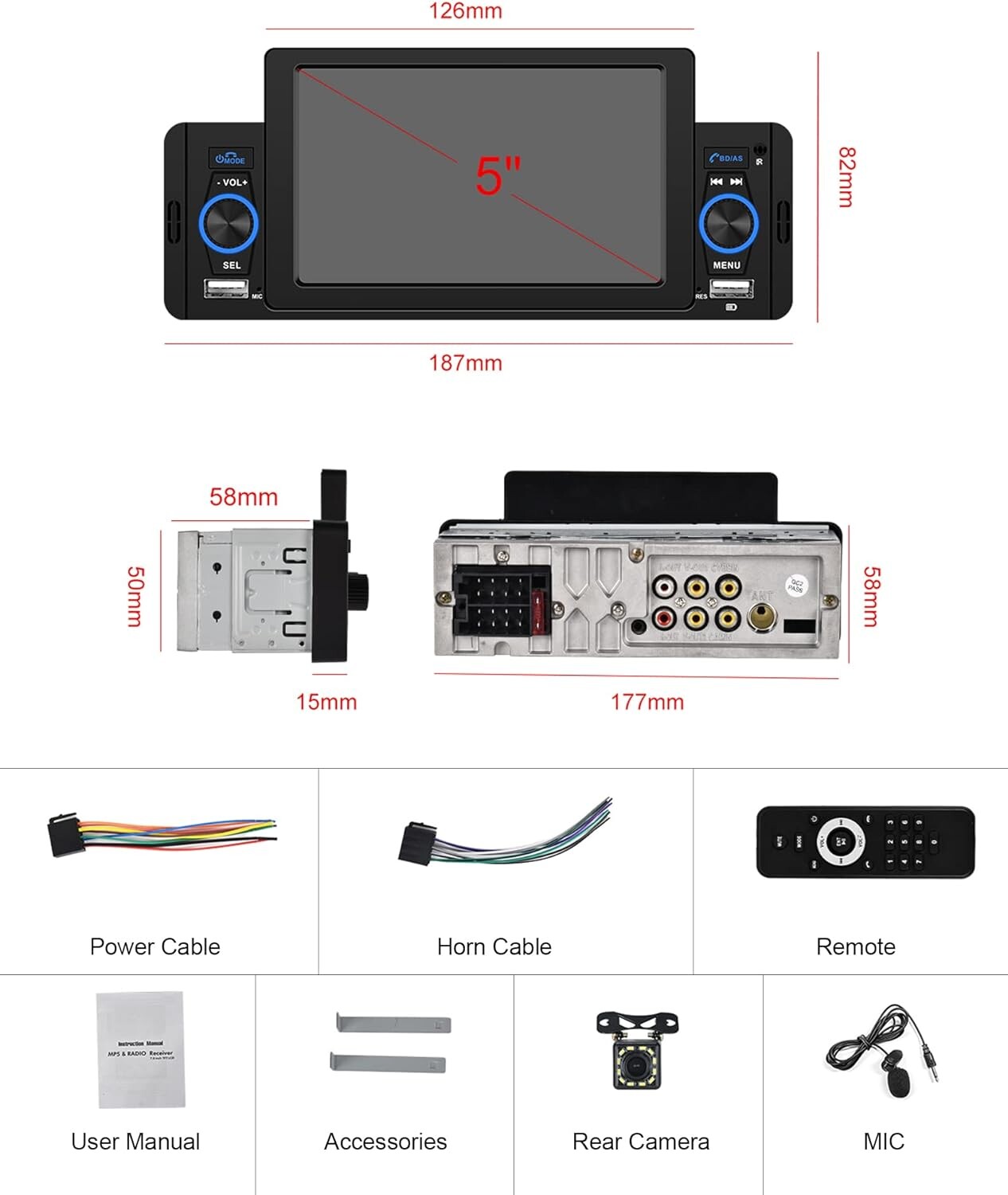 【5 Pouces Écran Tactile Autoradio 1 Din 】Cet Autoradio 5 Pouces 1 Din les dimensions de montage sont : 177mm * 58mm. Écran tactile HD de 5 pouces. L'interface d'entrée audio AUX prend en charge les fichiers MP3 externes, les téléphones portables, les lecteurs de musique, etc. Réglages du rétroéclairage coloré, le rétroéclairage coloré du bouton peut changer automatiquement. Autoradio 5 pouces avec télécommande et microphone vous rendent plus confortable. Soutien USB/TF/AUX/EQ. Soutien multilingue.