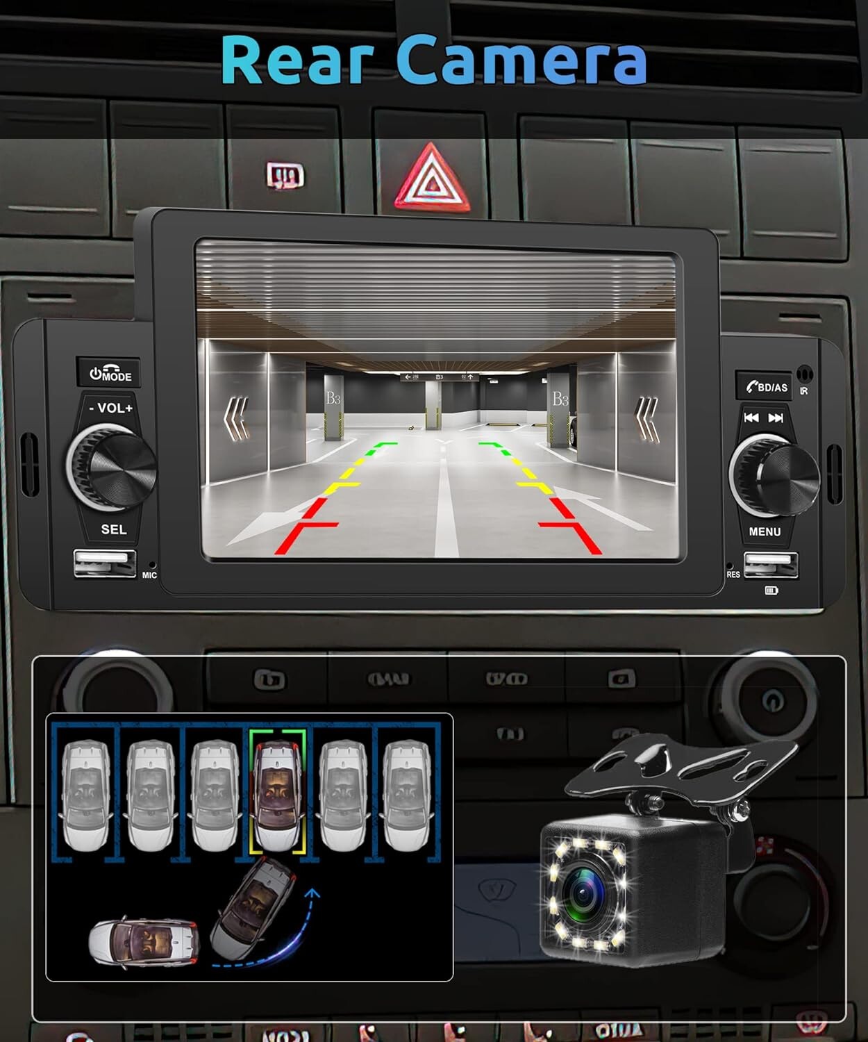 【Caméra de Recul & Commandes au Volant】1 Din Autoradio Bluetooth avec caméra de recul 12 LED.Lorsque le véhicule passe en marche arrière,l'écran de l'autoradio affiche automatiquement l'image de la marche arrière et enregistre le trafic,rendant votre marche arrière quotidienne plus sûre et plus pratique.Soutenir la fonction de commande au volant,changer rapidement les fonctions souhaitées avec le volant de votre voiture.