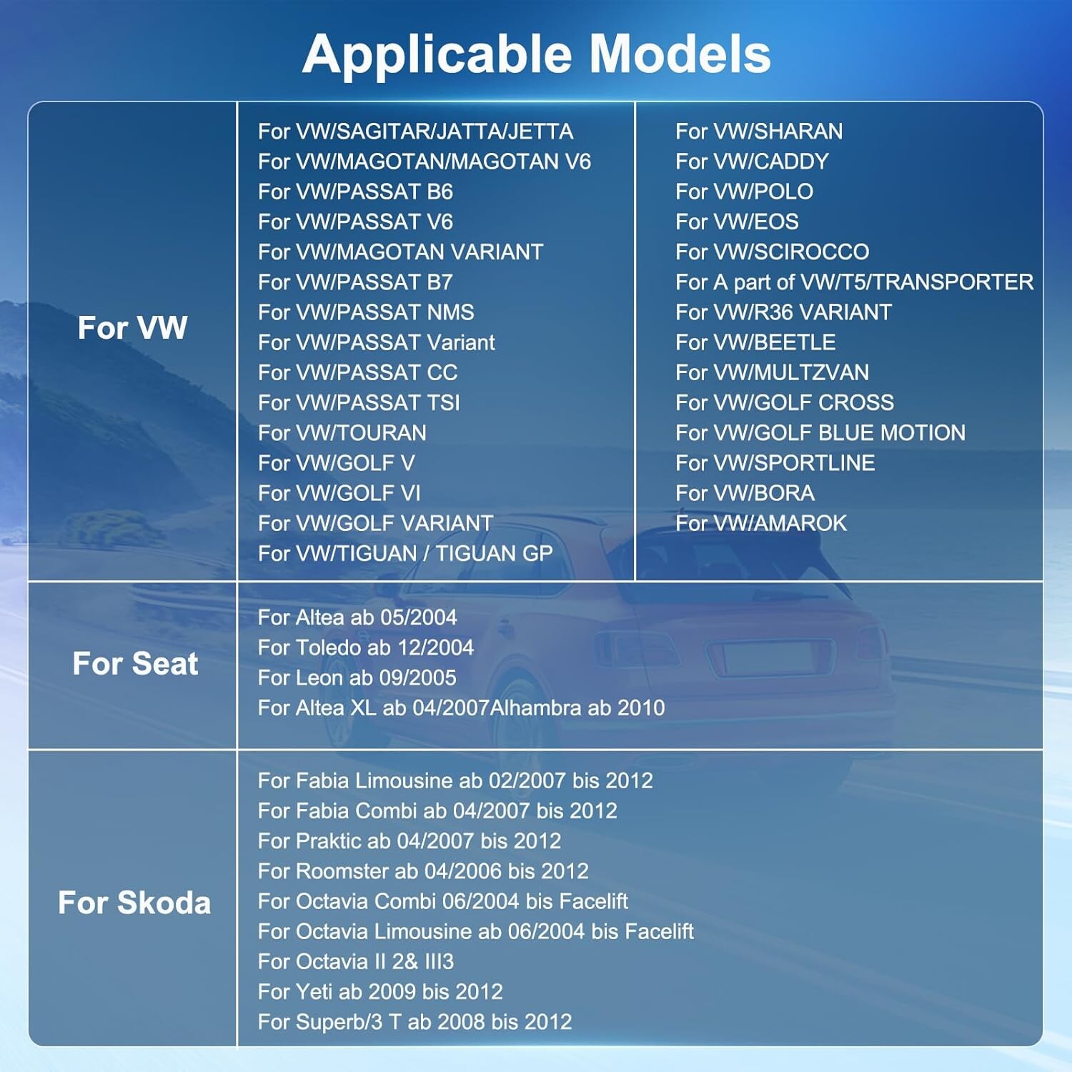 Volkswagen Golf 5/6, Passat B6/B7, T5, Jetta, Polo, Bora, Caddy, Magotan – ainsi que plusieurs modèles SEAT et SKODA.