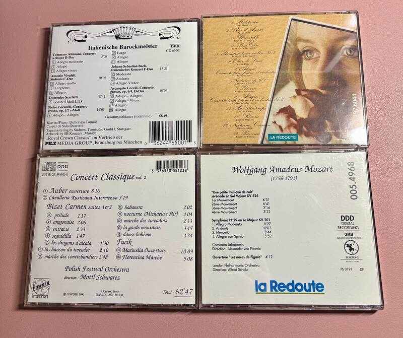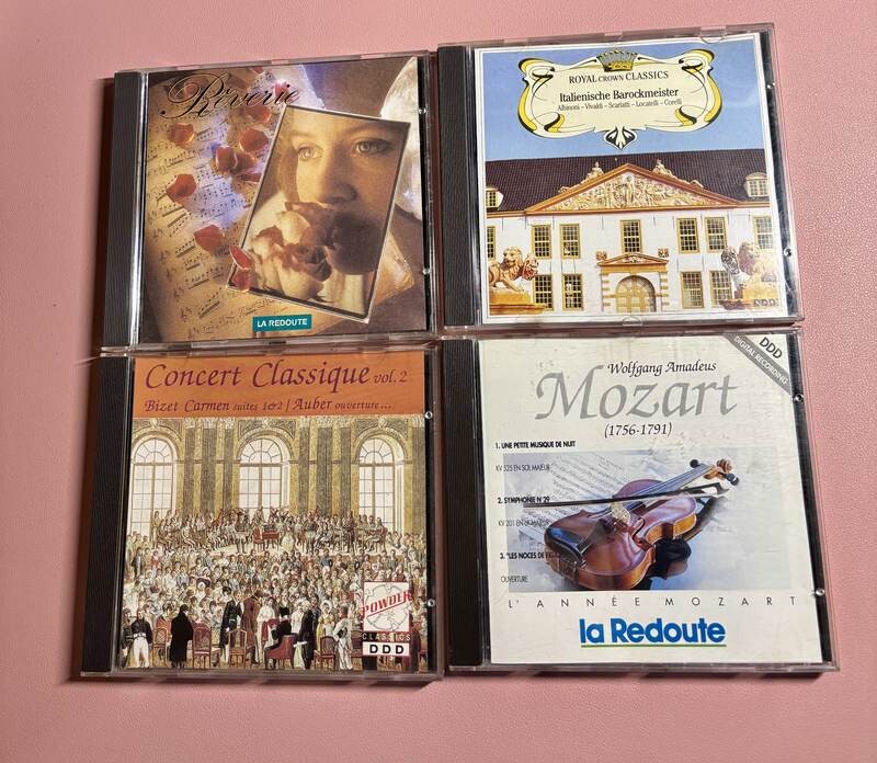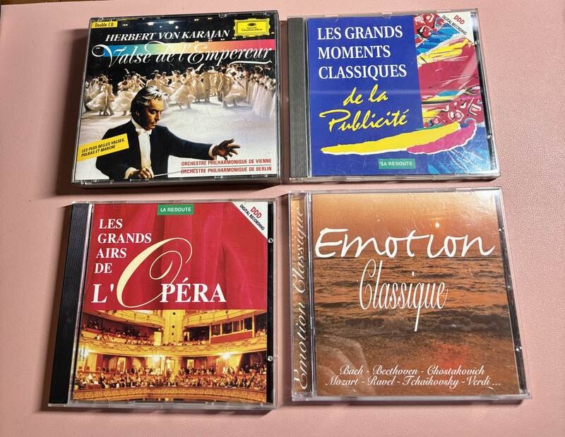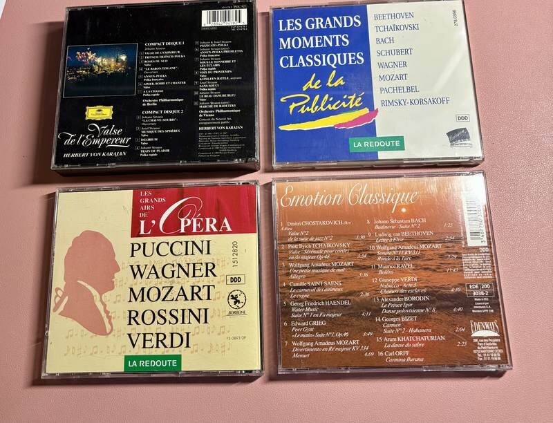 CD audio d’occasion en bon état général, couvrant un large répertoire allant de la musique orchestrale aux grands airs d’opéra, en passant par le baroque et les œuvres de Mozart.
