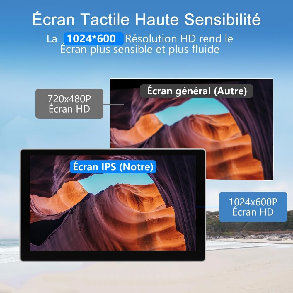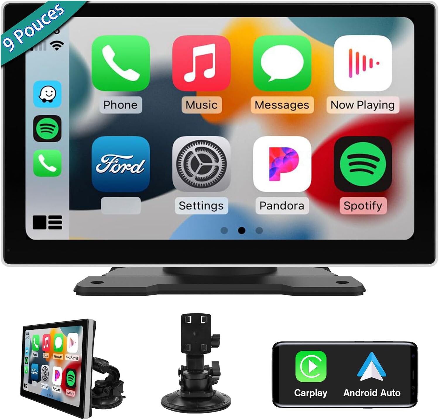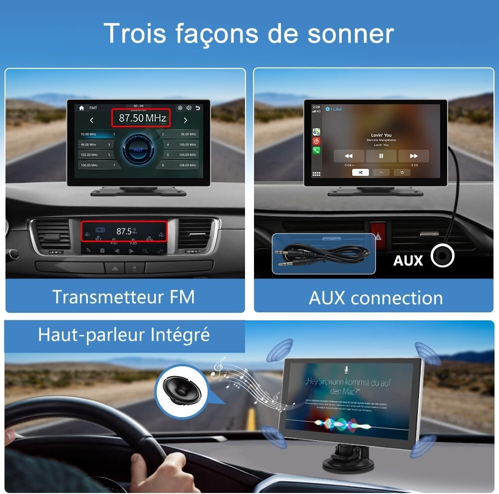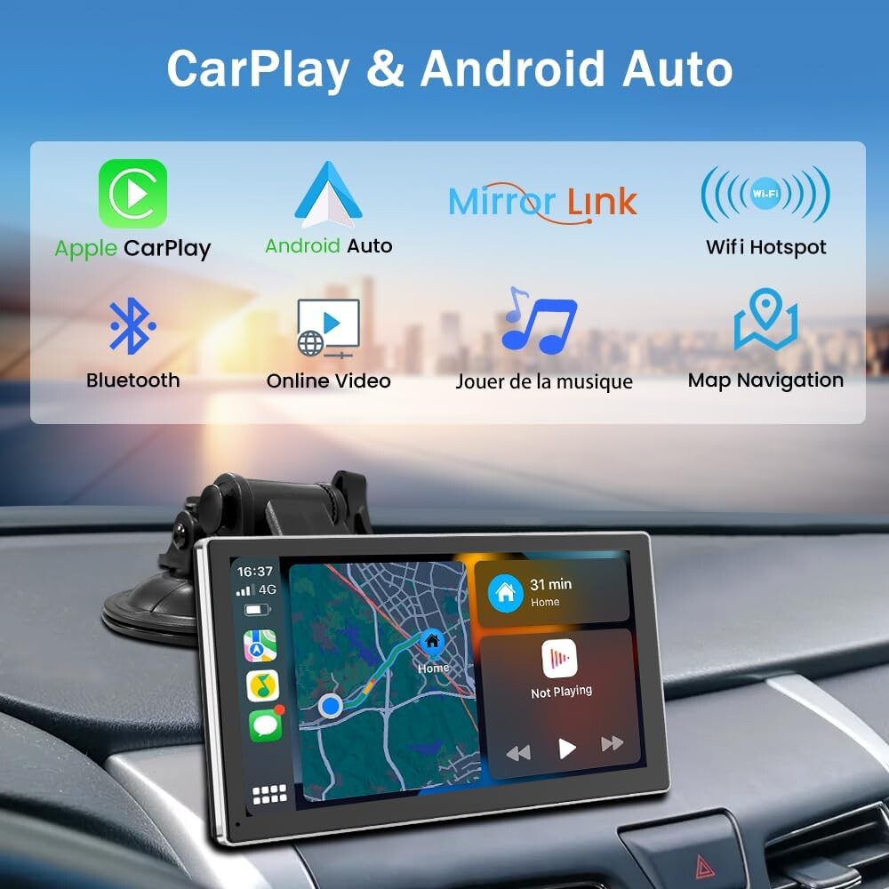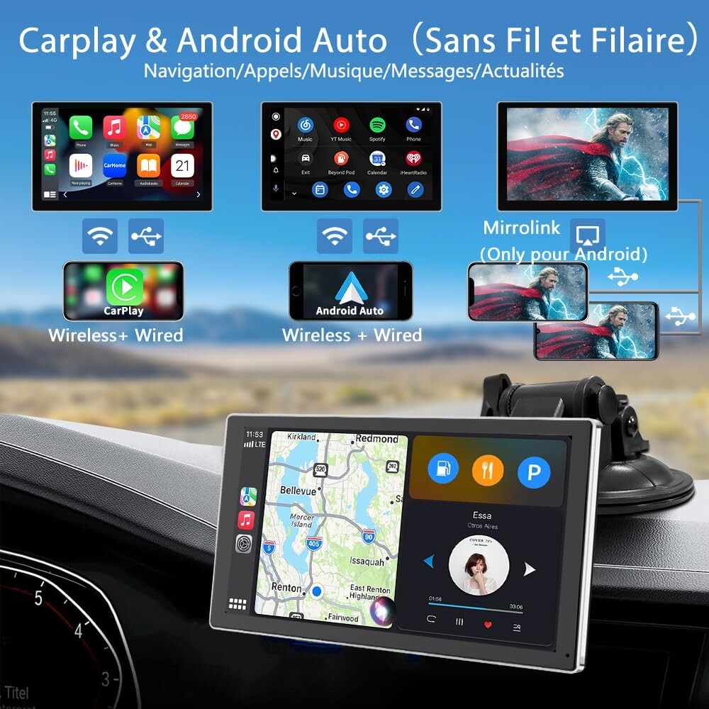 Cet écran est compatible avec CarPlay et Android Auto, permettant une utilisation filaire ou sans fil. Il offre la possibilité de contrôler les fonctions du téléphone via commande vocale (comme Siri), telles que la navigation GPS, la musique et les appels, sans toucher l'écran. Il garantit aussi une protection des données personnelles puisqu'il n'a pas de fonction réseau.