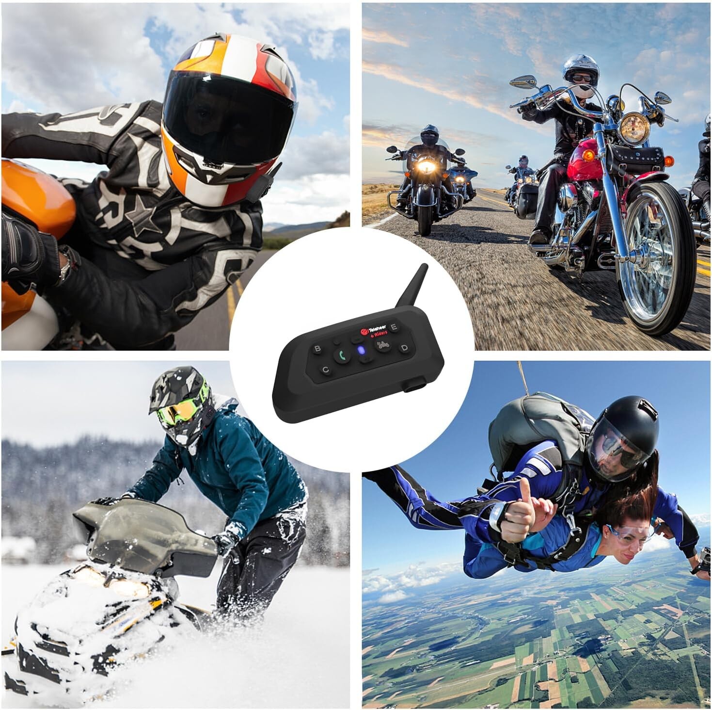Je n'ai pas tester non plus le fait de pouvoir communiquer avec des amis motards en virée moto mais nul doute que ça fonctionne. Techniquement on peut communiquer avec B-C-D-E (les lettres représentant un équipier sur 2 roues ou un passager éventuellement)