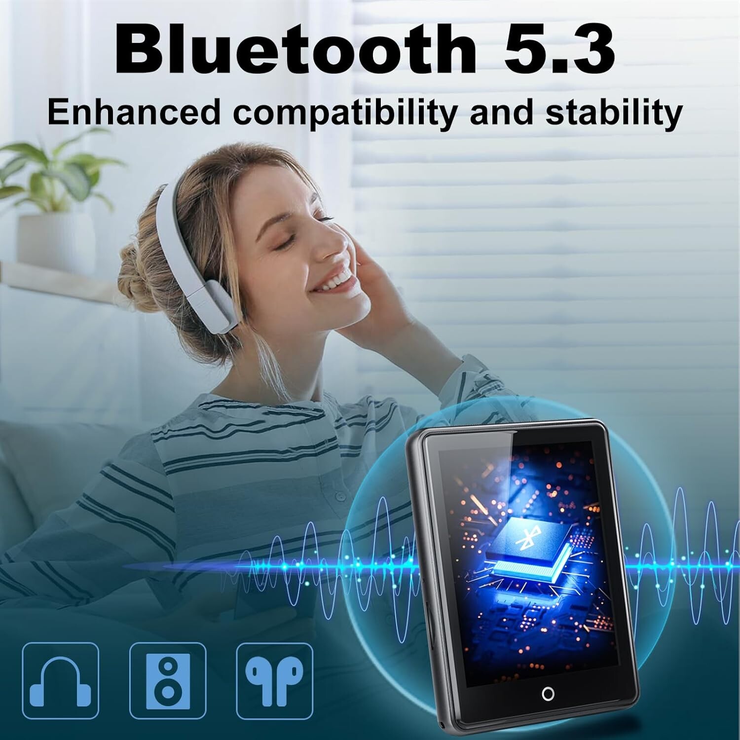 Profitez d'une connexion **ultra-stable et rapide** avec vos écouteurs et appareils Bluetooth grâce à la puce 5.3. La capacité anti-interférence garantit un son fluide, tandis que le haut-parleur intégré restitue des graves profonds, des médiums équilibrés et des aigus cristallins pour une expérience audio naturelle et réaliste. Compatible avec une large gamme de formats audio (MP3, WMA, FLAC, WAV, etc.), ce lecteur s'adapte à toutes vos playlists.