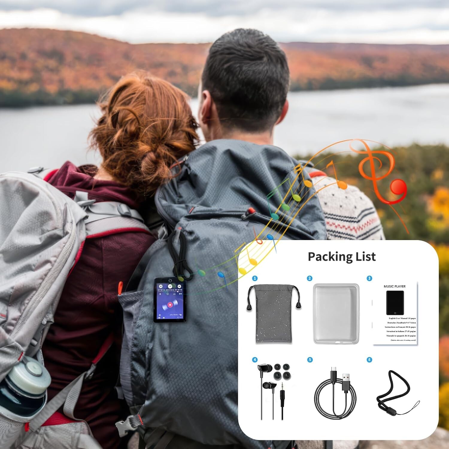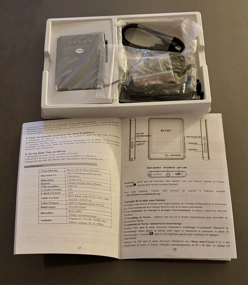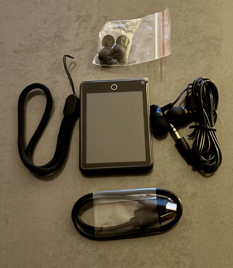 Sa **coque en alliage de zinc** garantit une protection maximale contre les chocs. Inclus : une housse en silicone pour protéger les bords, un cordon anti-chute et un sac de rangement pour l’écran. Compact et pratique, ce lecteur MP3 est parfait pour l’extérieur et se glisse facilement dans vos poches ou sacs.