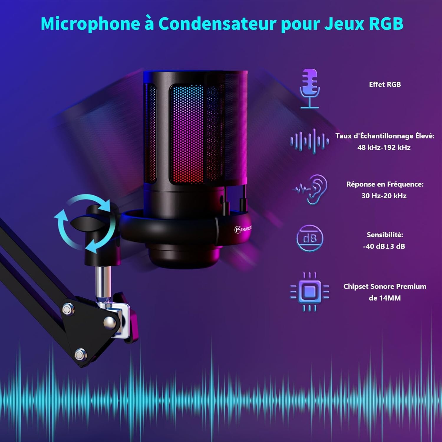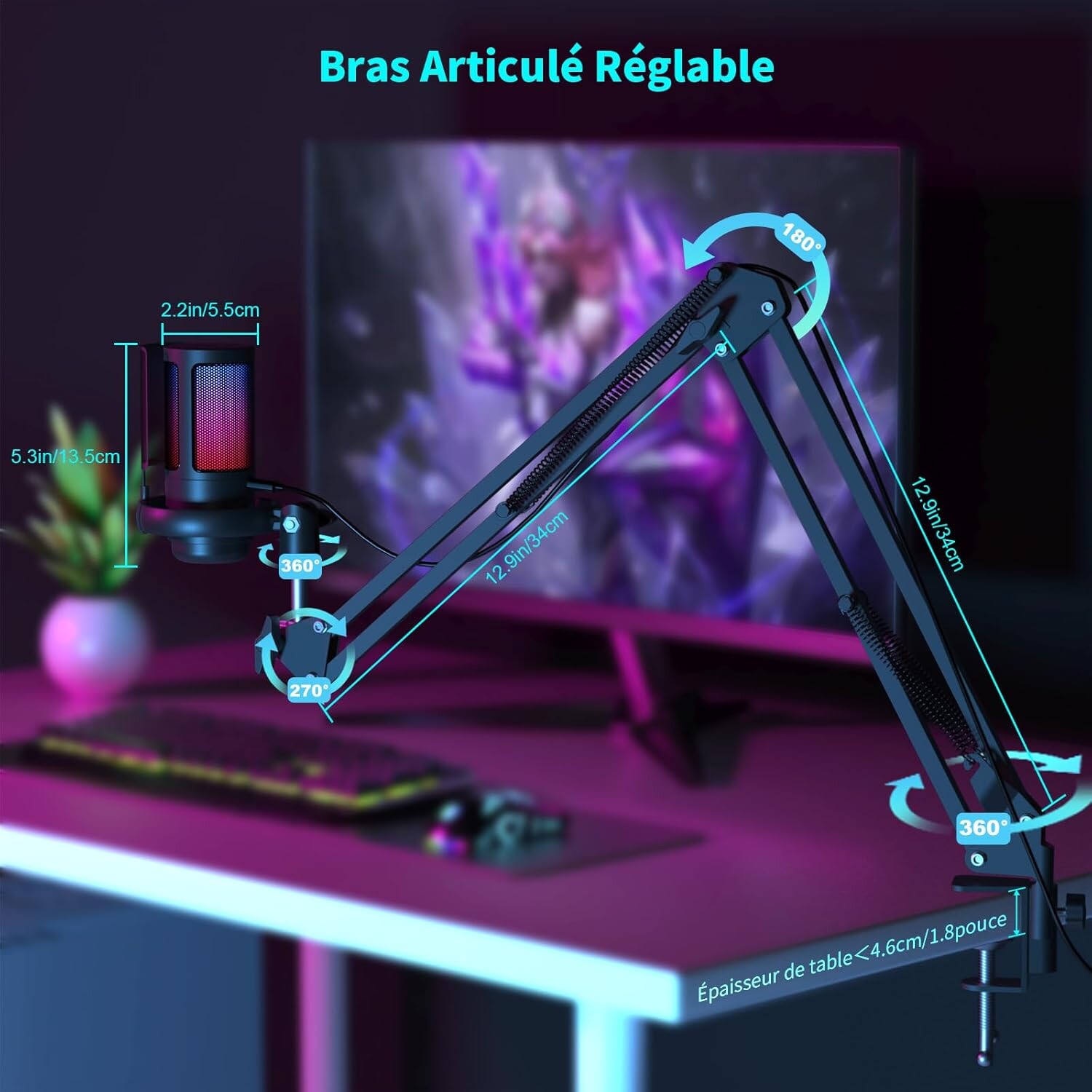 Microphone RGB pour Gaming avec Bras Articulé pour l'Enregistrement de Podcasts et streaming