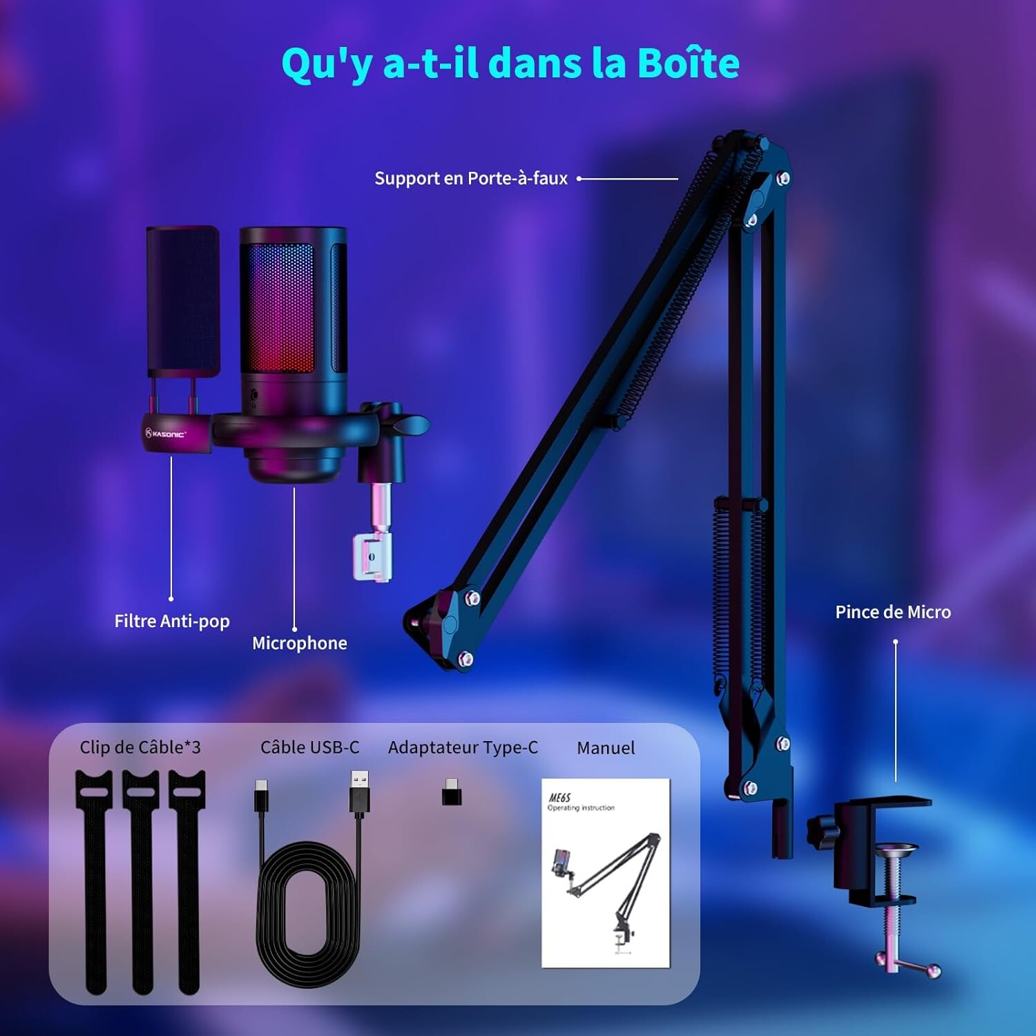 - **Package complet** : Inclus un bras de support, suspension anti-choc, filtre anti-pop, et tous les accessoires nécessaires, avec une garantie de 24 mois et support à vie.