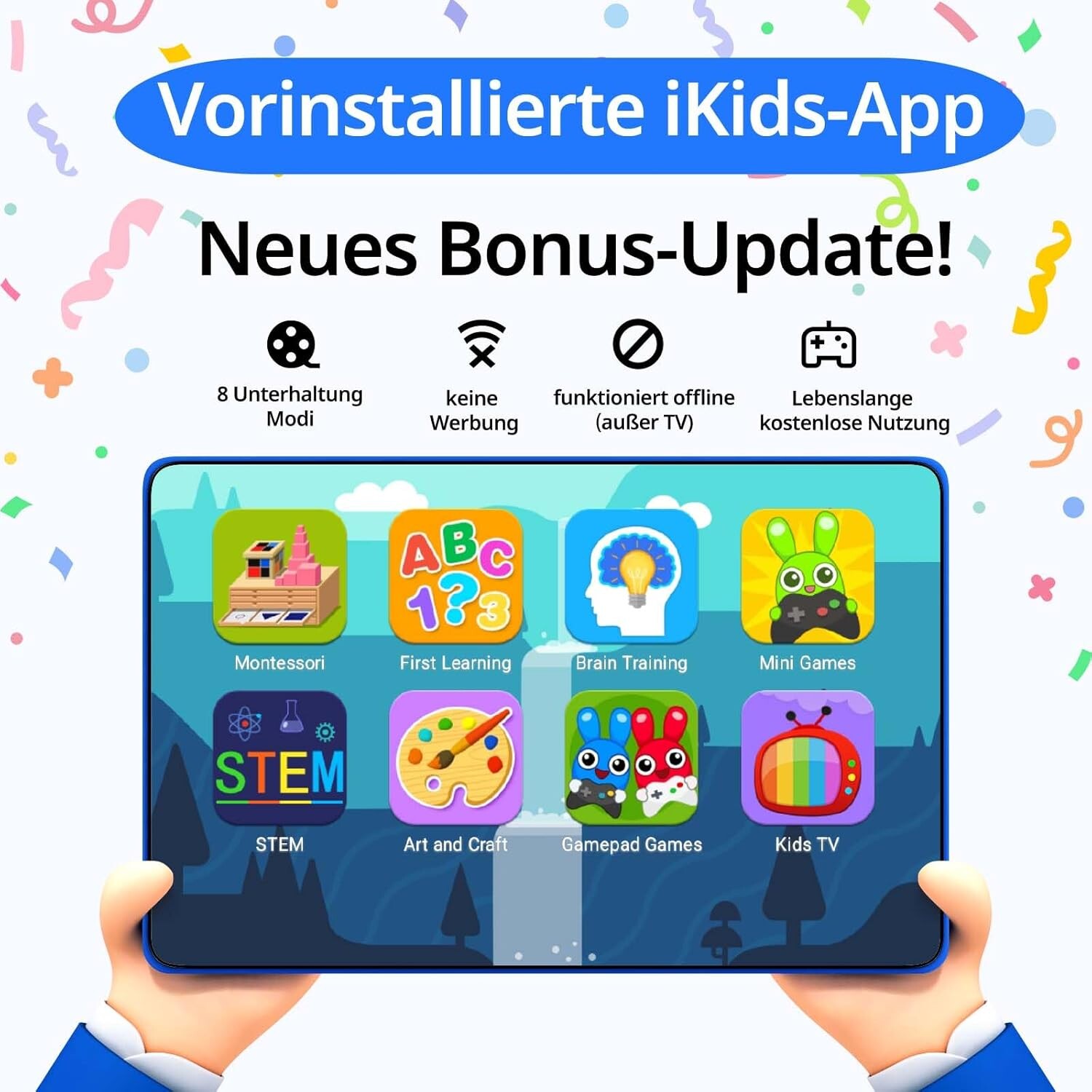 Applications éducatives incluses : Kids Space et iKids, sans publicité, avec contenu interactif, jeux, vidéos et cours Montessori.