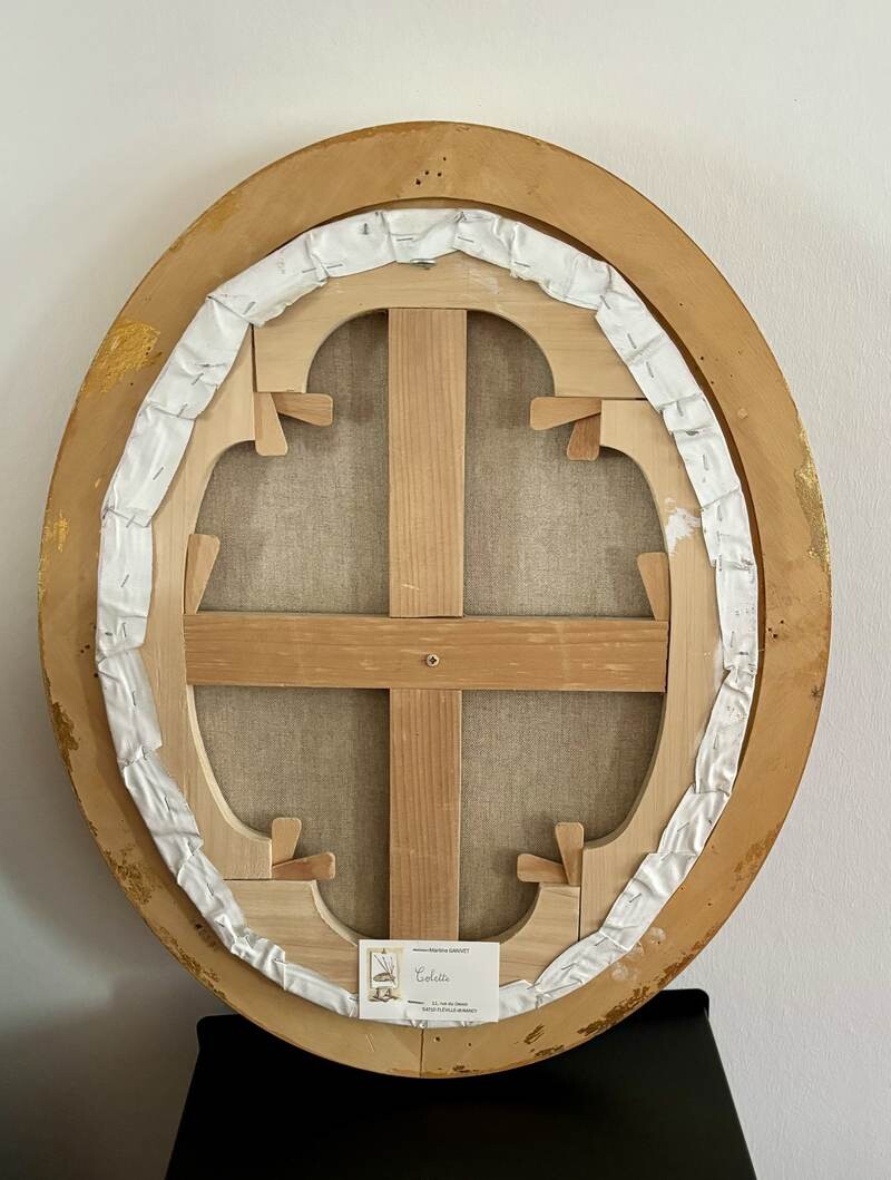 **Cadre** : Le tableau est encadré dans un cadre ovale richement orné, doré, qui ajoute une touche de sophistication et de charme classique à l'œuvre.