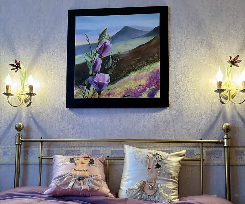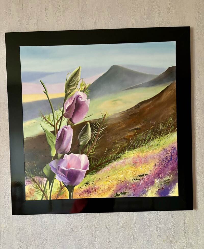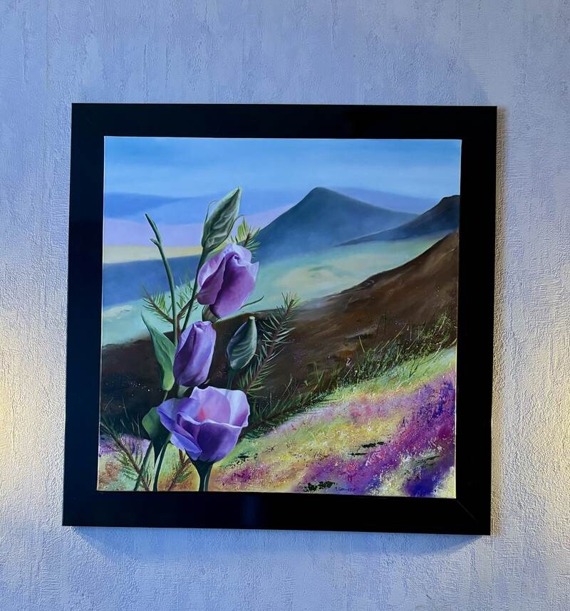 La peinture capture des fleurs violettes au premier plan avec en arrière-plan un paysage pittoresque de montagnes et de champs colorés