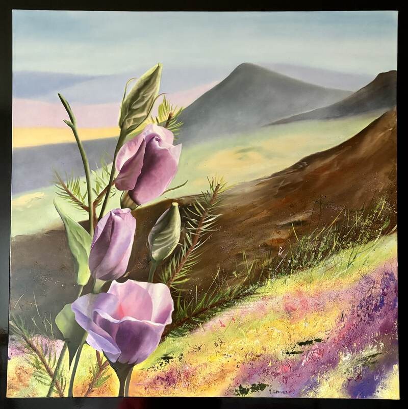 J'ai observé l'image du tableau. C'est une œuvre vraiment magnifique! La peinture capture des fleurs violettes au premier plan avec en arrière-plan un paysage pittoresque de montagnes et de champs colorés. Les fleurs sont détaillées et vibrantes, contrastant avec les tons plus doux et plus subtils du paysage.