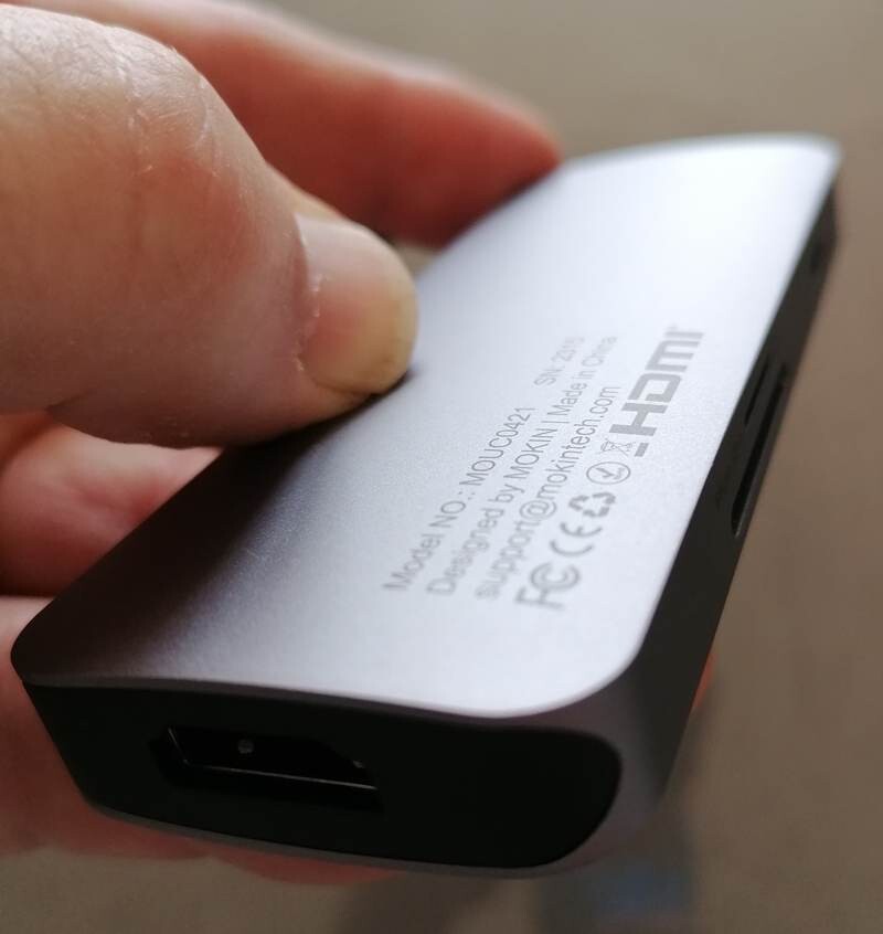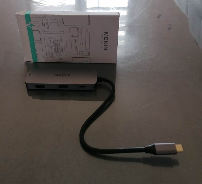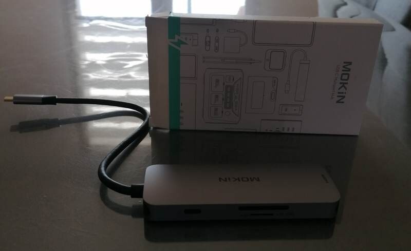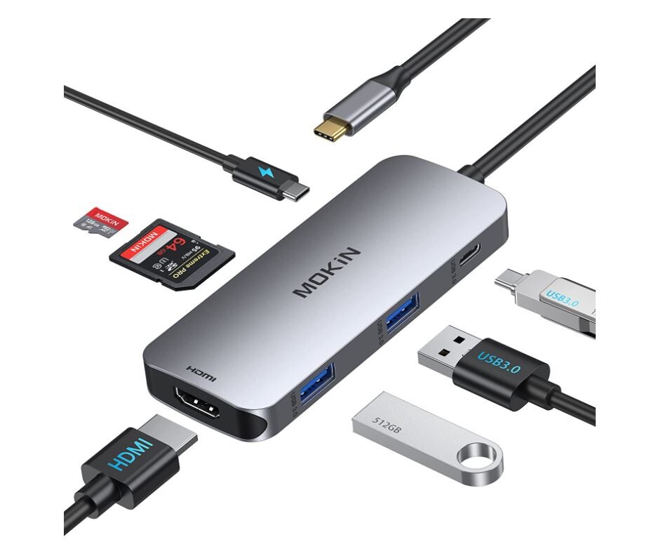 Adaptateur Hub 7 en 1 de la marque MOKIN qui combine différents ports USB 3.0 de type A et de type C ainsi que 2 ports SD et d'un port HDMI compatible 4K.