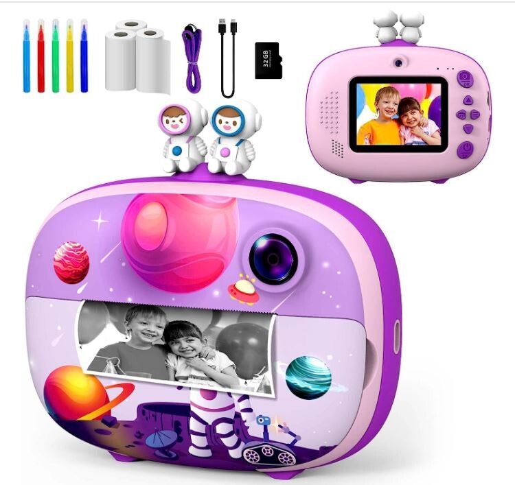 Appareil photo pour enfants, qui est à la fois un appareil photo numérique et un appareil photo instantané pour les enfants, en outre, la nouveauté de la conception de deux poupées sur le dessus de l'appareil, est une expérience de jouet unique pour les enfants, pour susciter leur désir d'explorer le monde...Les enfants peuvent prendre des photos en couleur et des vidéos HD 1080p et imprimer des photos en noir et blanc. Cadeau d'anniversaire/de Noël/d'un jour parfait pour les enfants de 3 à 12 ans.