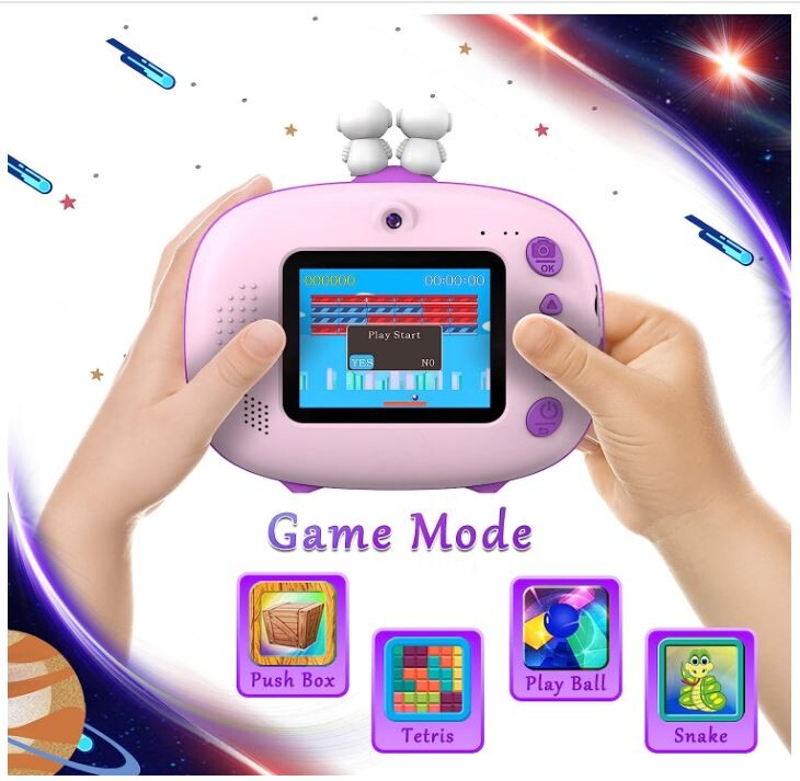 La carte SD de 32GB et le lecteur de carte sont inclus ! L'appareil photo prend en charge l'enregistrement vidéo, la lecture, le retardateur, l'enregistrement en accéléré et le zoom numérique 10x, et 30 cadres photo amusants, 6 filtres de couleur et 5 effets miroir pour que les enfants puissent vivre différentes expériences en prenant des photos. Les 4 jeux de puzzle (Snake, Tetris et Sokoban) sont parfaits pour le développement de l'intelligence des enfants.