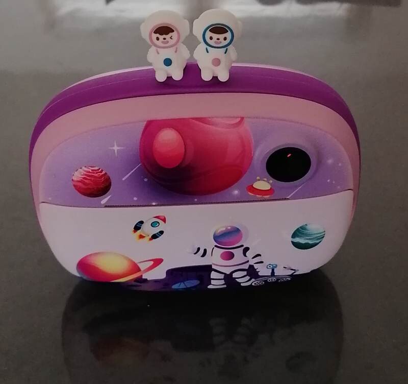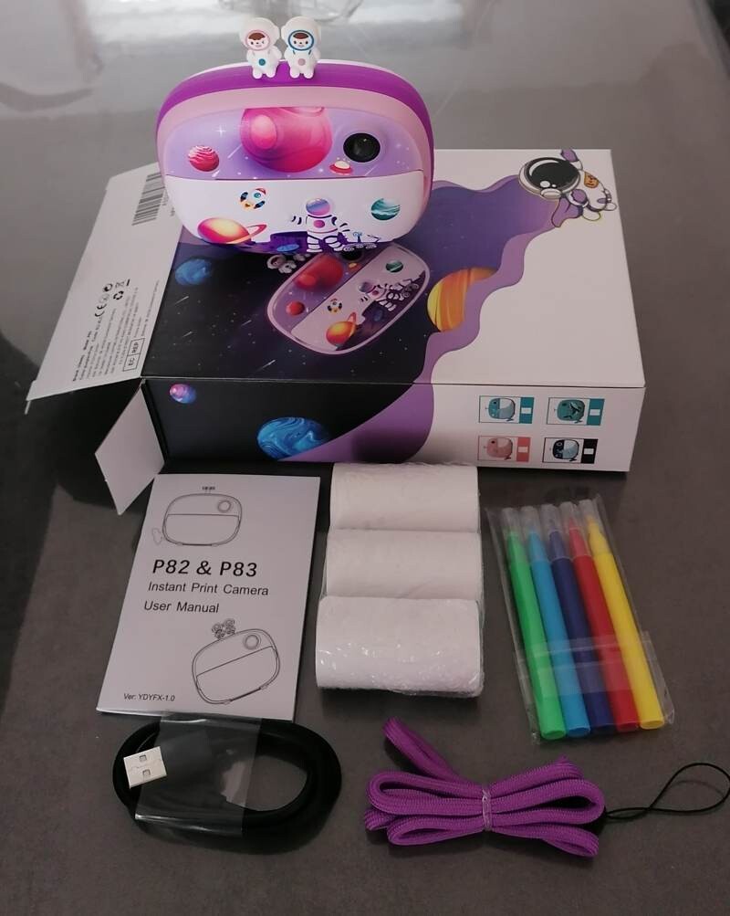 Livré dans sa boîte d'origine avec 5 feutres, câble USB, 3 bobines thermiques d'impression photo, sa carte 32GB et une bandouillère.