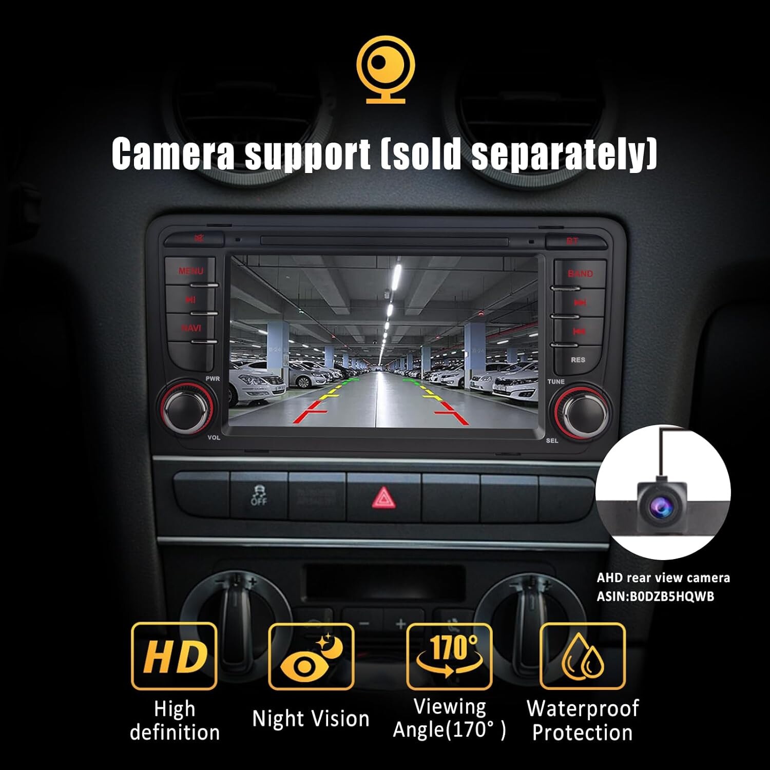 L’appareil prend en charge une caméra de recul AHD avec vision nocturne (non incluse). Visualisation instantanée sur l’écran dès que vous passez la marche arrière.