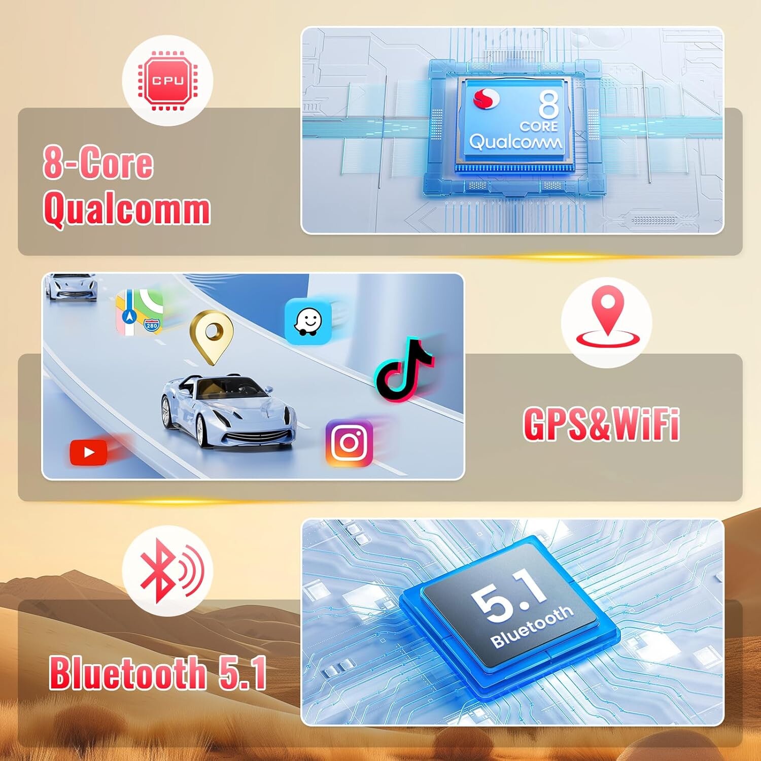 • Navigation GPS & WiFi : guidage précis, infos trafic et divertissement en ligne.