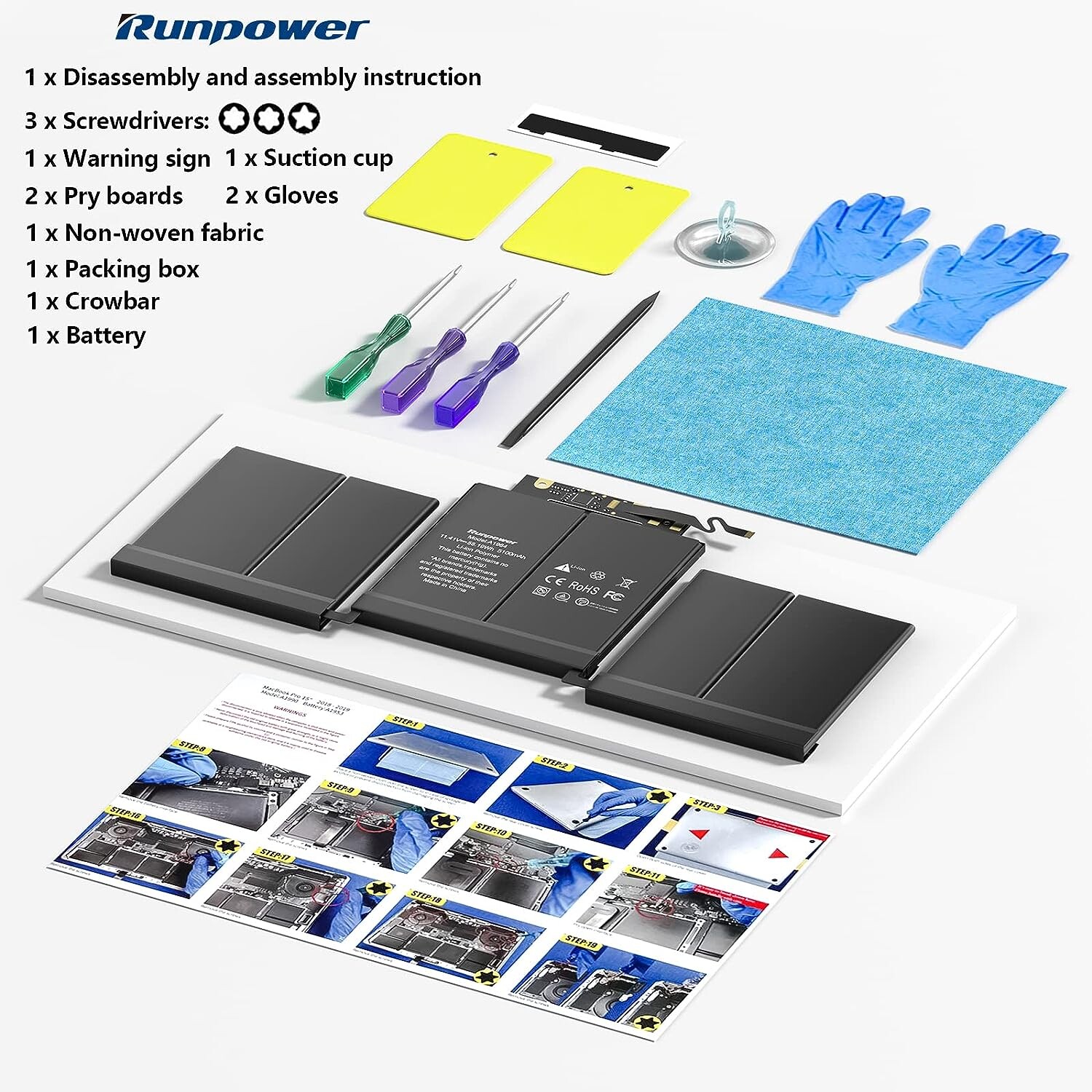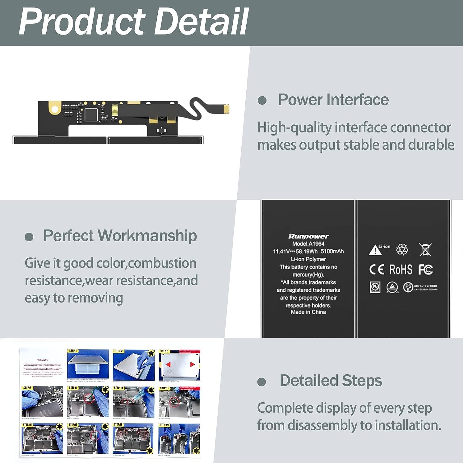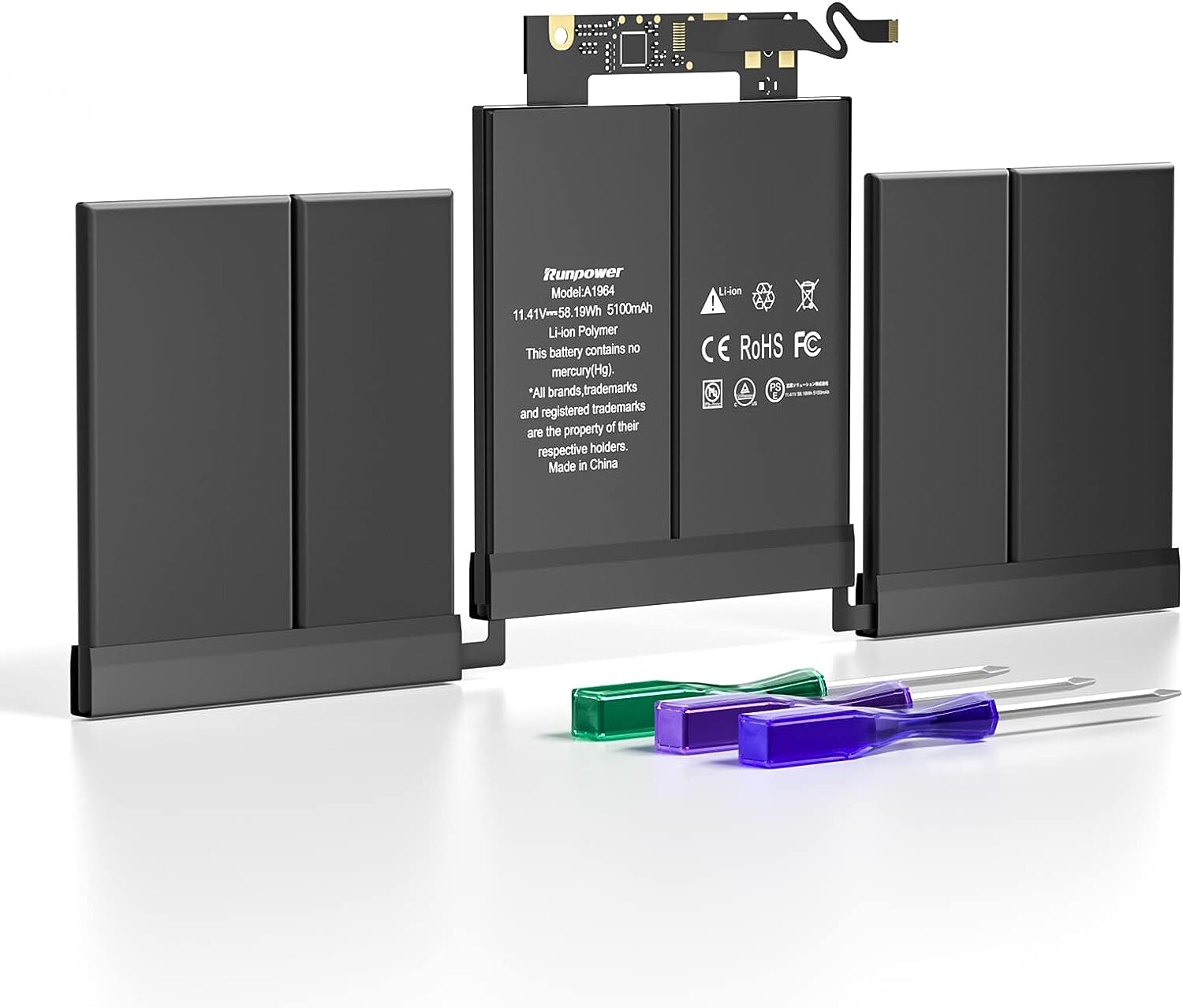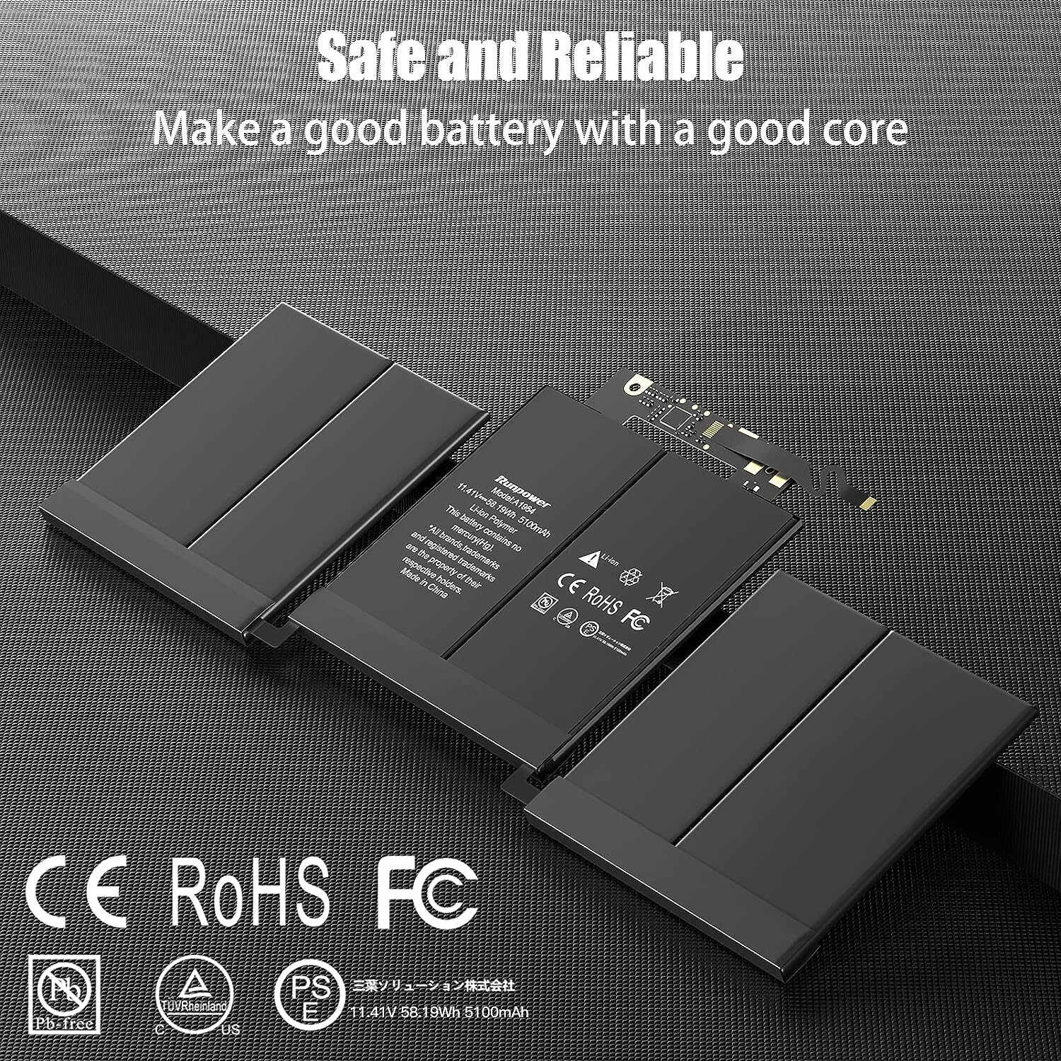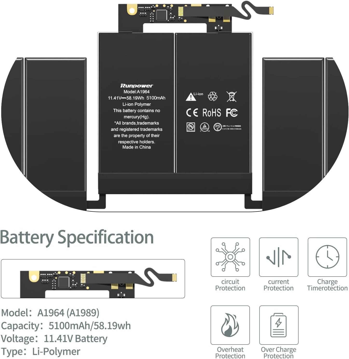 Conforme aux normes de sécurité élevées : ces batteries Runpower de rechange pour ordinateur portable sont 100 % compatibles avec les batteries d'origine. La batterie A1964 est certifiée PSE/CE/FCC/UL/RoHS.