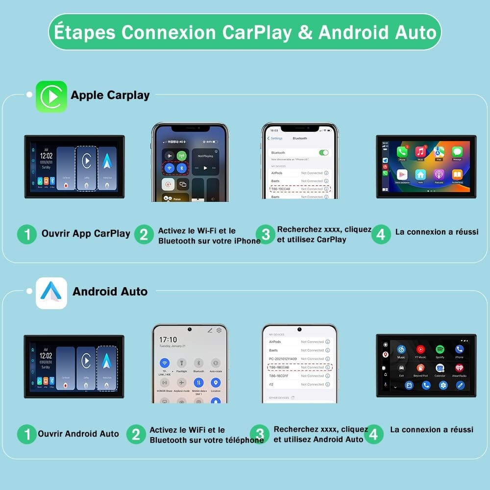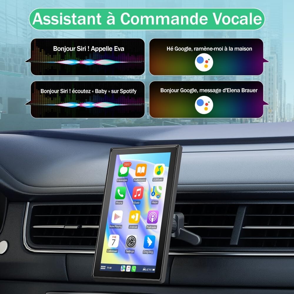 Plus besoin de câbles : le système se connecte automatiquement au démarrage via Bluetooth et WiFi. Contrôlez tout avec Siri ou Google Assistant : appels, musique, GPS, messages...