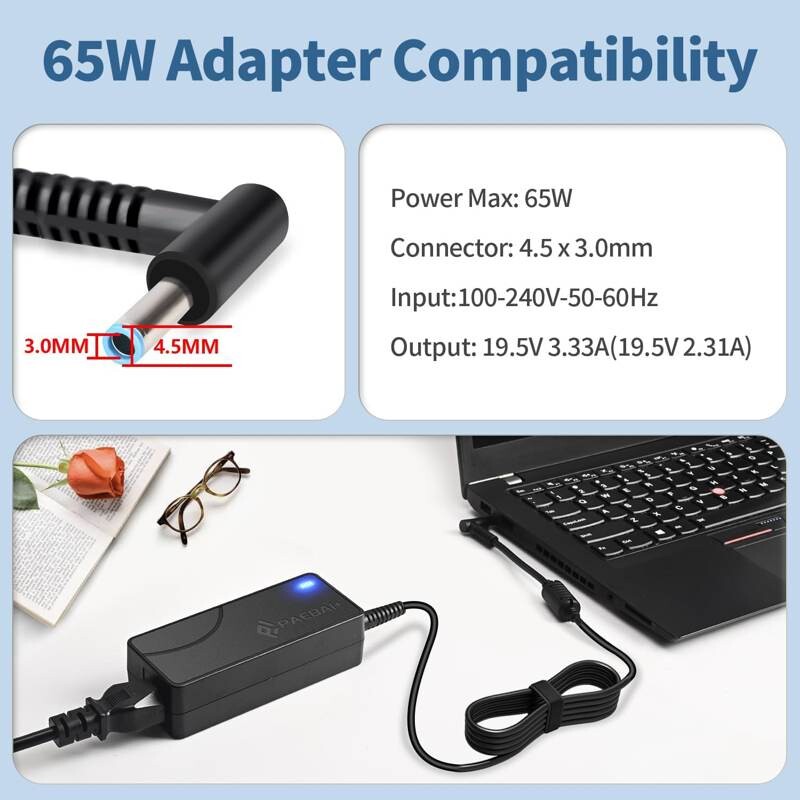 【PARAMÈTRES DU PRODUIT】Output Max : 19,5V 3,33A 65W (également compatible avec l'ordinateur portable HP 19,5V 2,31A 45W) ; Input:100 - 240V /50 - 60Hz, Taille du connecteur : 4,5 x 3,0mm Blue Tip