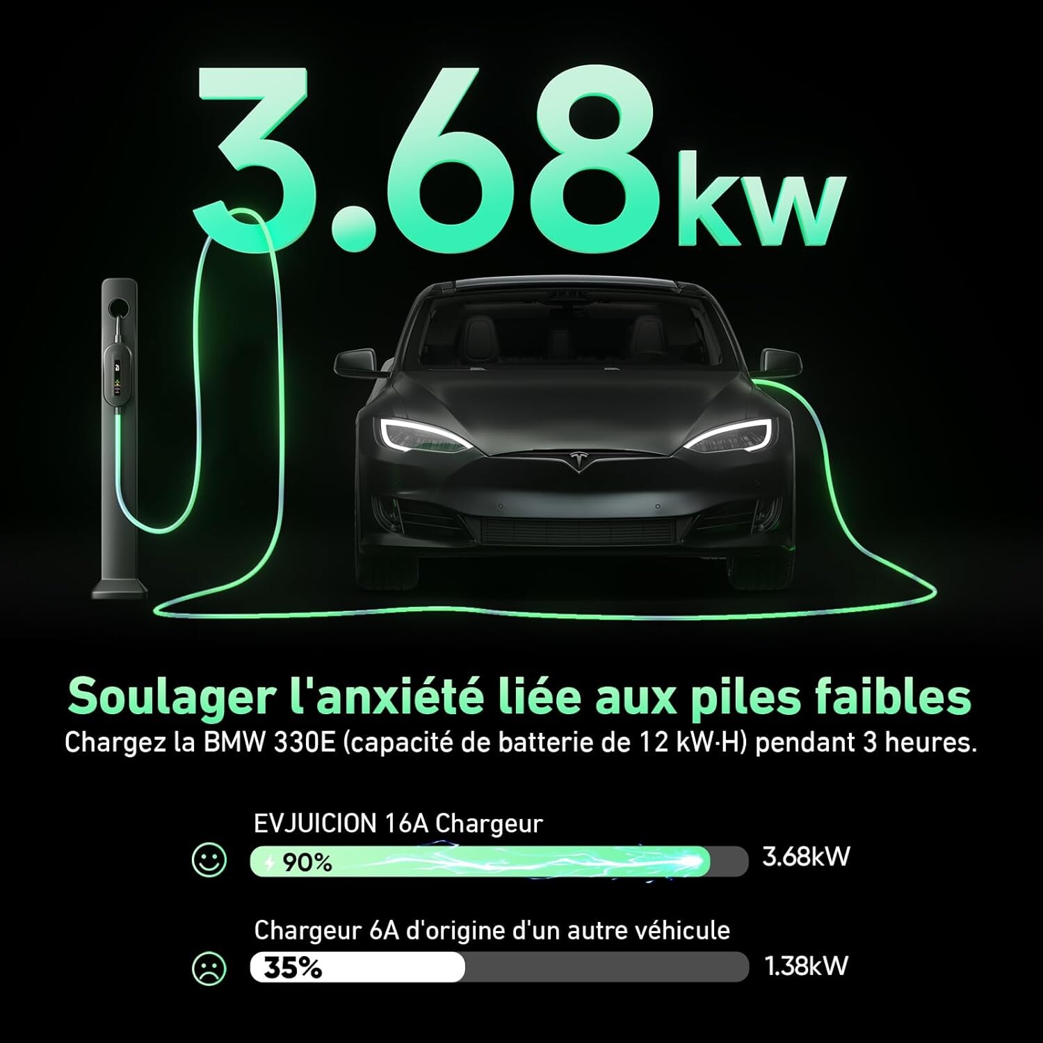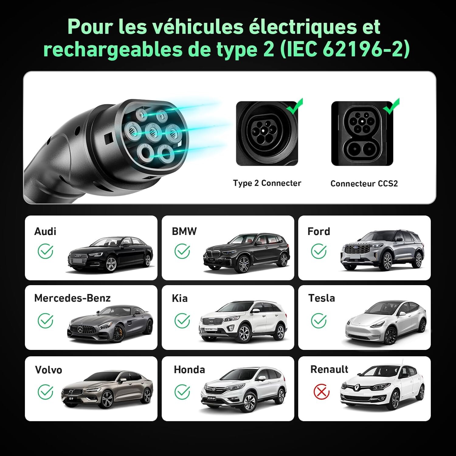 • Compatible avec la majorité des VE et PHEV européens type 2 : Tesla, MG, Volvo, Audi, Skoda, BMW, etc.