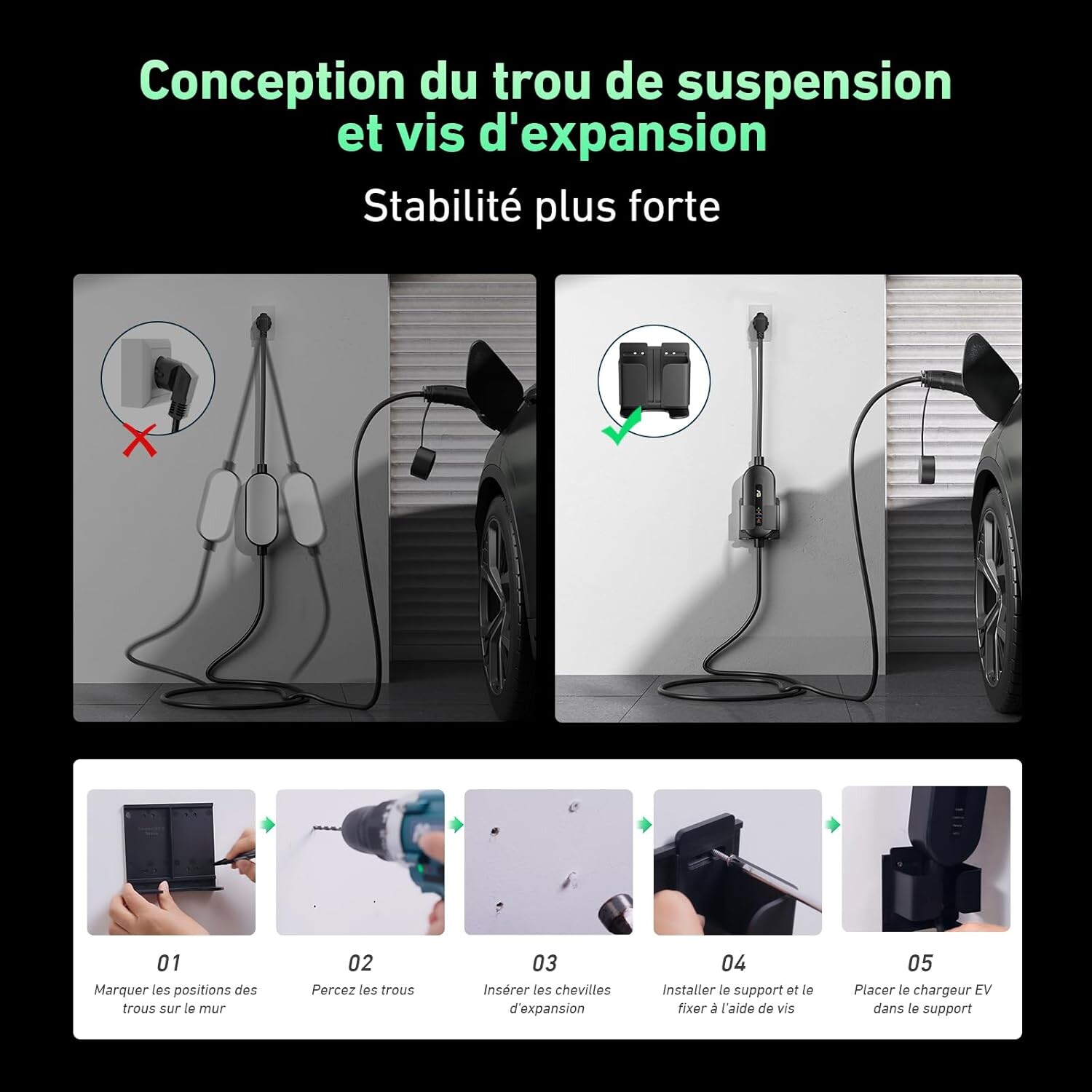 • Fixation murale incluse : vis, support et trous prévus pour une installation propre à la maison.
