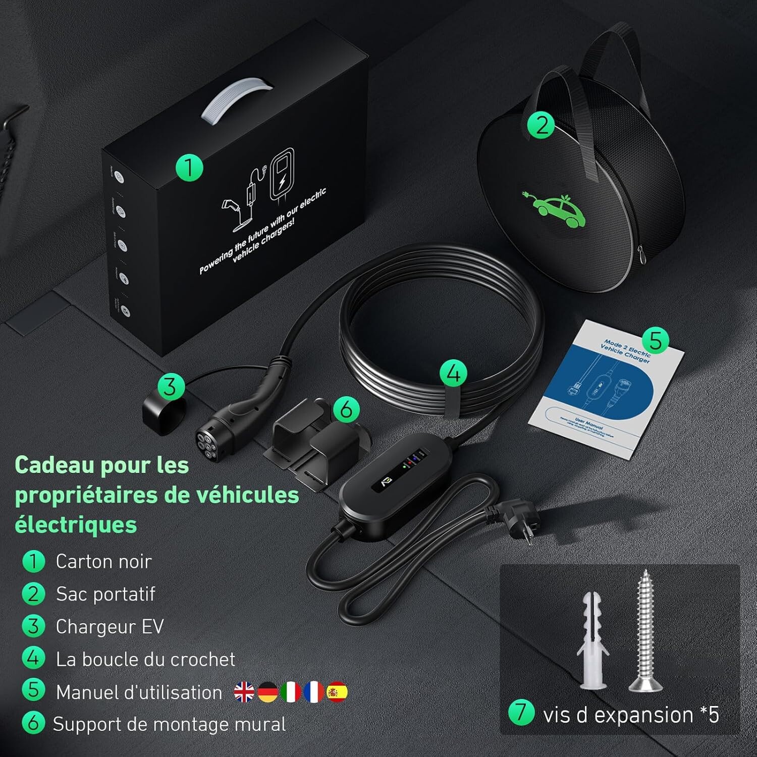 Chargeur de voiture électrique Type 2 – 16A – 3,68kW – avec sac de transport et fixation murale