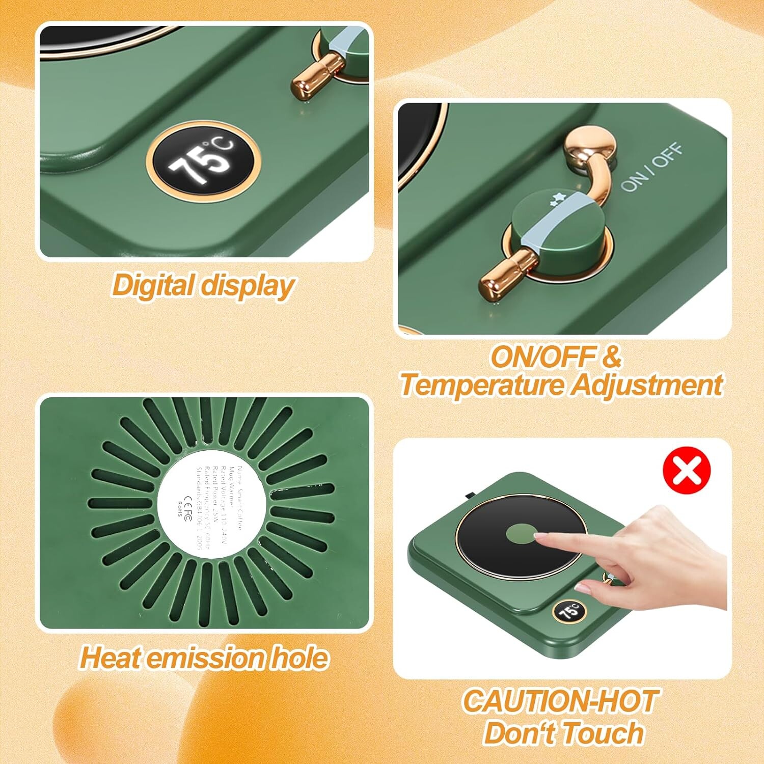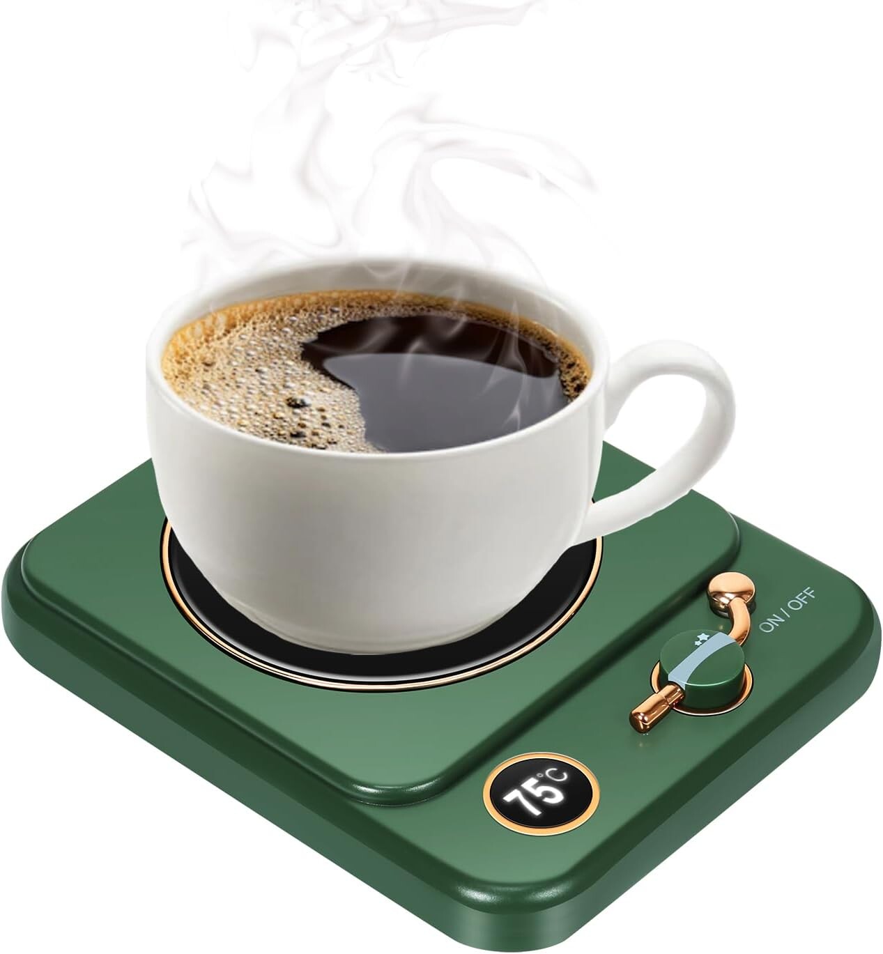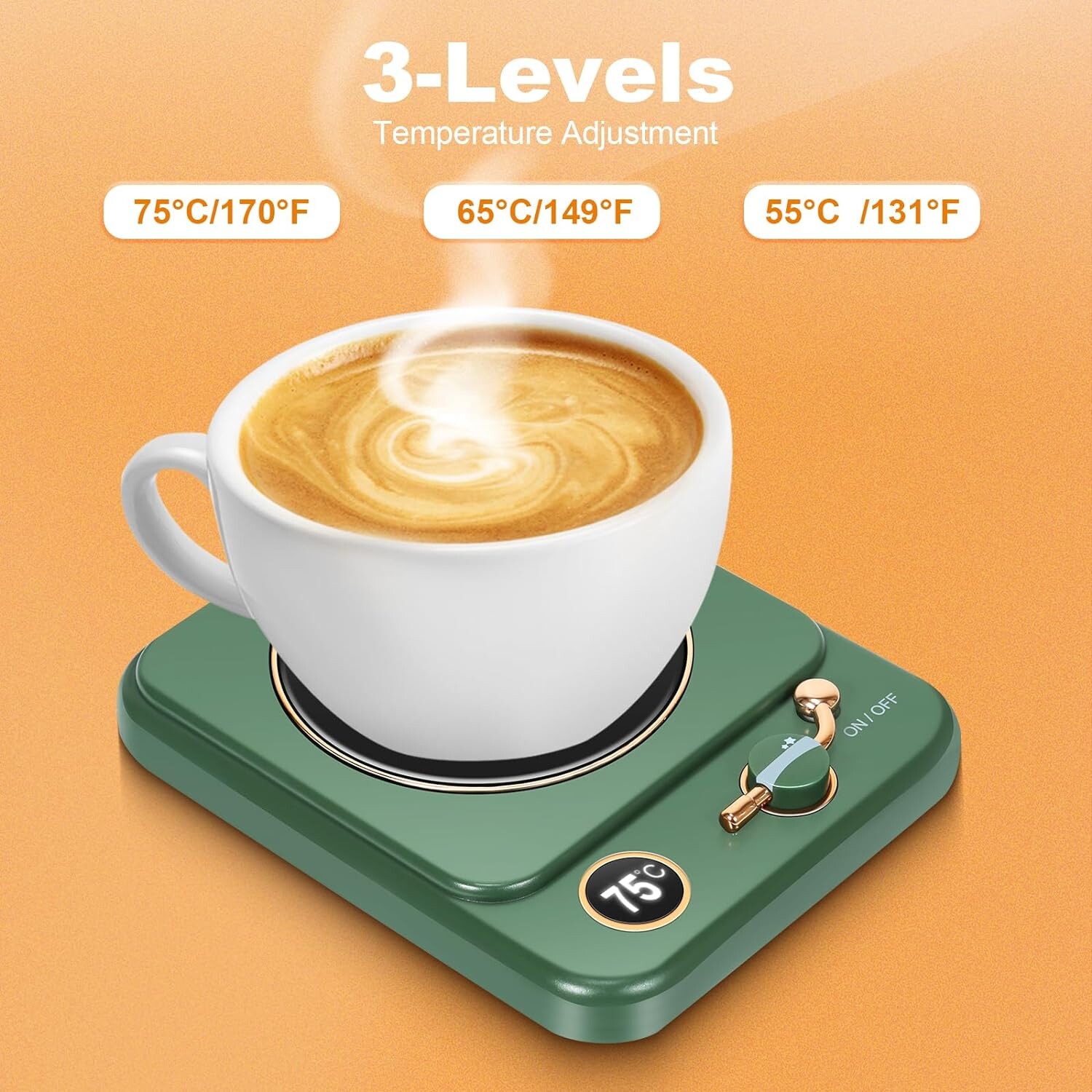 【VOTRE COMPAGNON CHAUD】 AVEC 3 NIVEAUX DE TEMPÉRATURE : Vous avez la possibilité de régler le dessous de verre chauffe-tasses sur trois niveaux de contrôle de température différents : 55°C, 65°C et 75°C. En utilisant ce chauffe-tasse électrique, les boissons chaudes restent chaudes plus longtemps dans votre tasse. Nous avons largement testé ce dessous de verre chauffant et il est capable de réchauffer facilement des boissons au-dessus de 75°C tout en les maintenant à une température confortable.【CHAUFFE-TASSES DE 8 HEURES】Tu n'as pas à te soucier d'éteindre ou non le chauffe-tasses électrique - sa fonction d'arrêt automatique s'en charge pour toi. Ainsi, tu peux toujours être sûr que tes boissons restent à la température de service optimale. Avec le chauffe-tasses électrique, tu disposes d'une solution pratique et efficace sur le plan énergétique pour garder tes boissons au chaud.