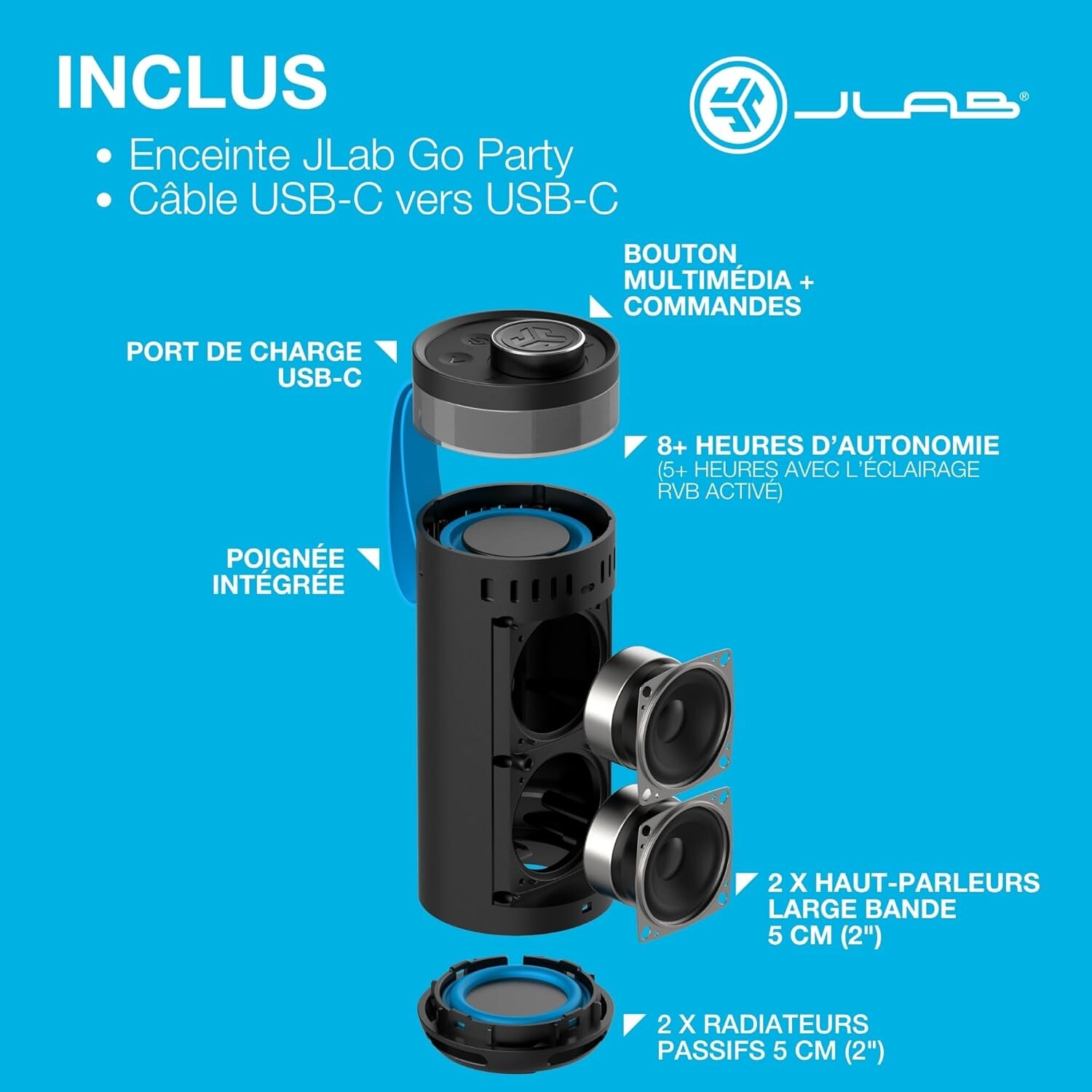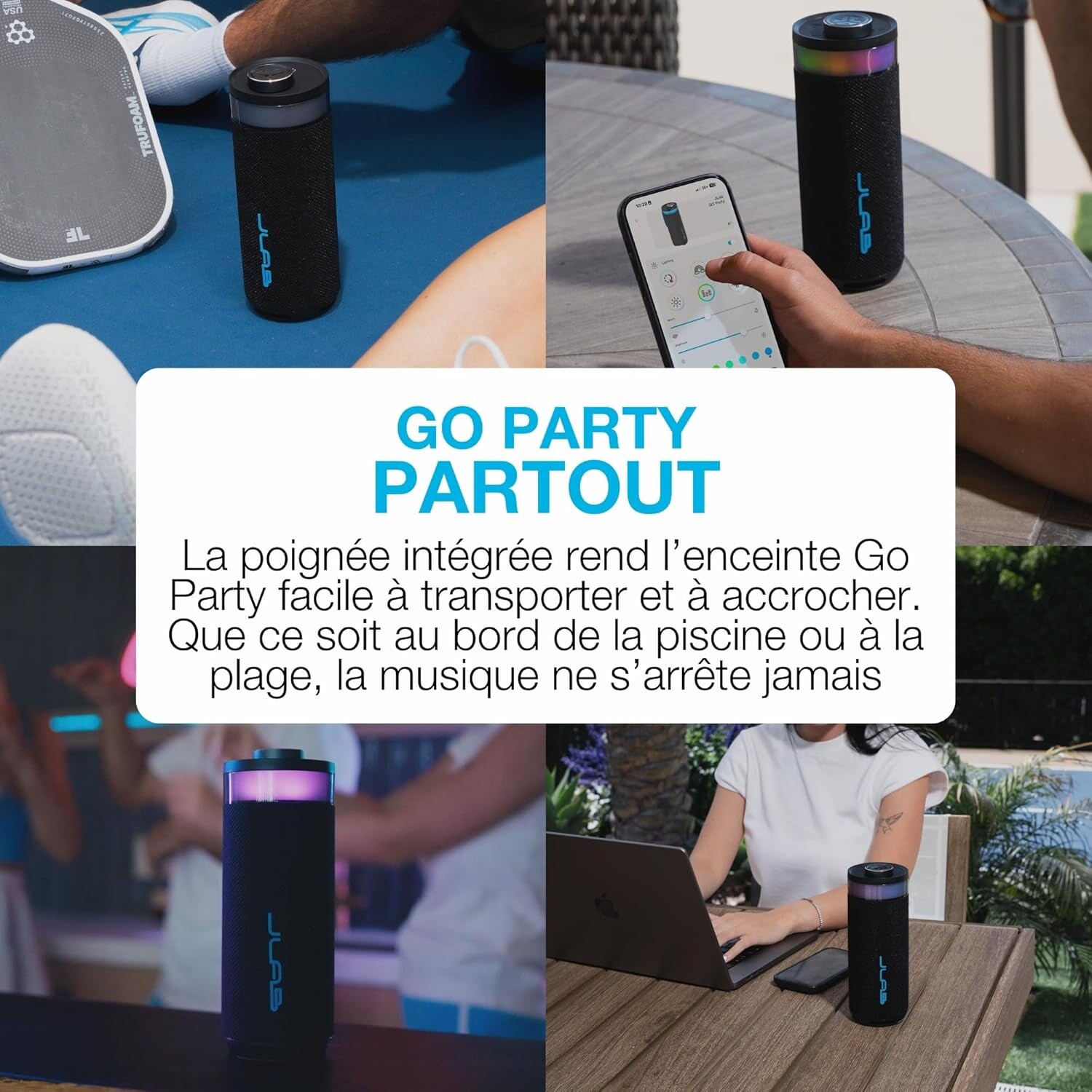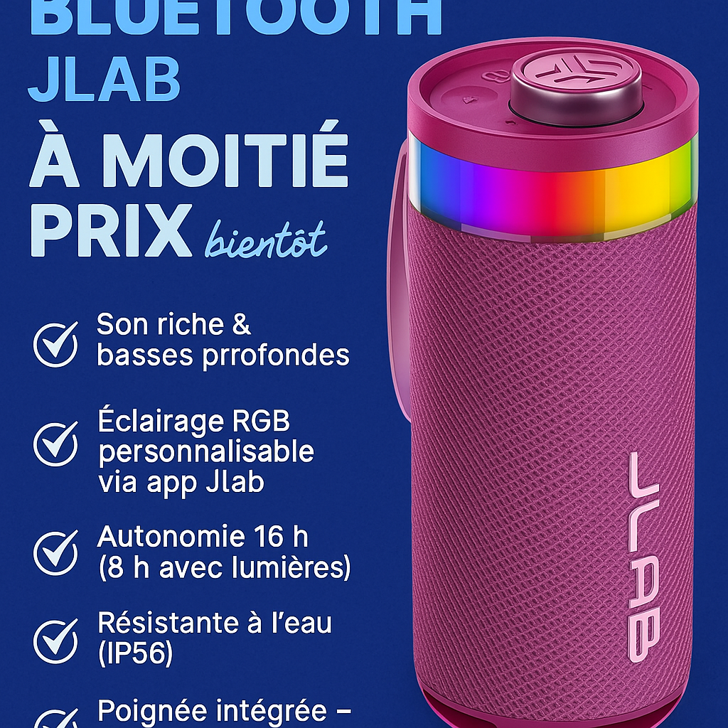 Emmenez la musique partout avec cette enceinte Bluetooth portable signée **JLab** ! Grâce à sa **poignée intégrée**, elle vous accompagne aisément de la maison à la terrasse, du bord de la piscine jusqu’à la plage. Conçue pour les aventuriers comme pour les amoureux du son, elle combine puissance, autonomie et effets lumineux spectaculaires.