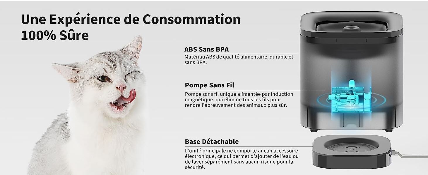 Silencieuse et sûre: cette fontaine à eau est équipé d’une pompe à eau sans fil qui facilite le démontage et le nettoyage. Il adopte la conception de la séparation de l’eau et de l’électricité pour une plus grande sécurité. Le décibel de travail du fontaine à eau est inférieur à 35 dB et ne perturbe pas votre sommeil et celui de votre animal de compagnie.(La base du fontaine à eau a un câble USB, qui doit être équipé d’un adaptateur, et l’adaptateur n’est pas inclus dans l’emballage)