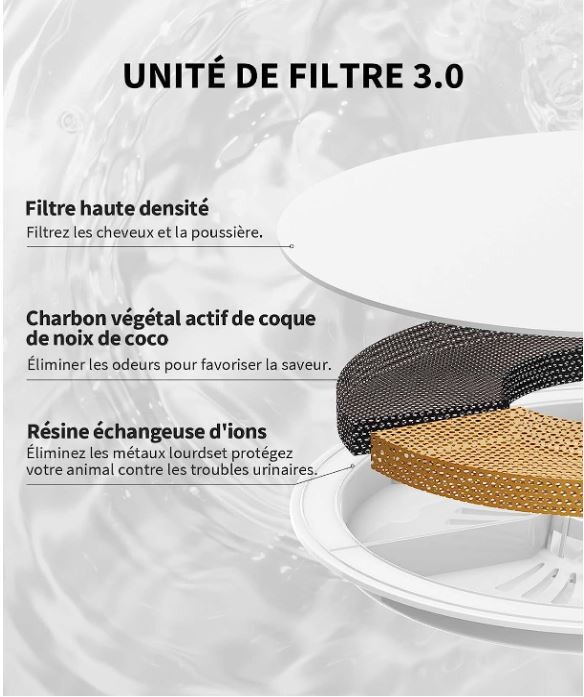 Système de Filtration Amélioré: La fontaine à eau utilise un élément filtrant 3.0 amélioré, un filtre haute performance composé de couches supérieures et inférieures de coton, de charbon actif en coquille de noix de coco et de résine échangeuse d'ions. Des matériaux de qualité alimentaire forment un système de filtration quadruple pour fournir une eau saine et riche en oxygène à votre animal.