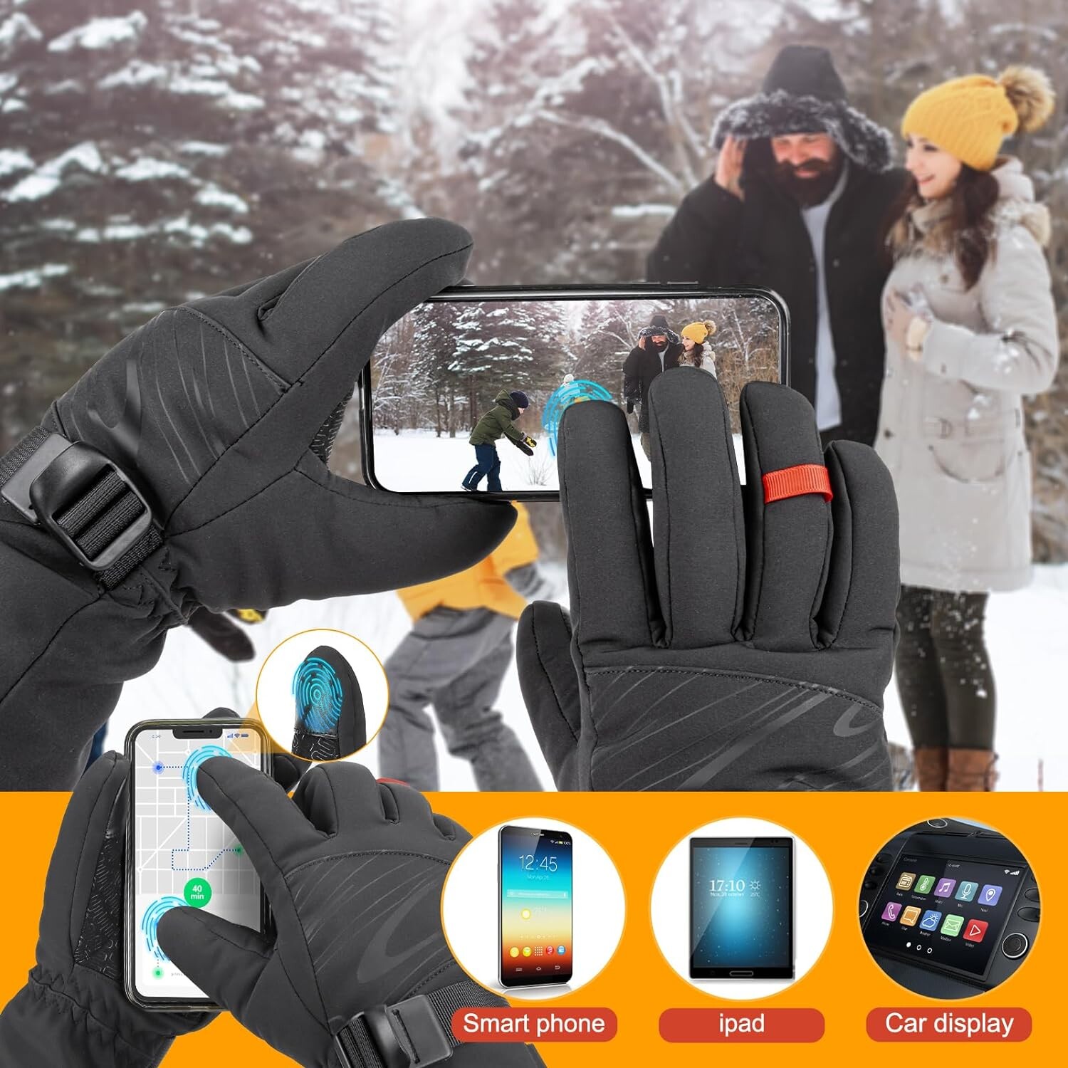 【Écran Tactile Haute Sensibilité】Le bout du pouce et de l'index est en cuir conducteur d'écran tactile, adapté à tout appareil intelligent. ce qui vous permet de répondre aux appels ou de parcourir des sites Web sans retirer les gants chauffants.