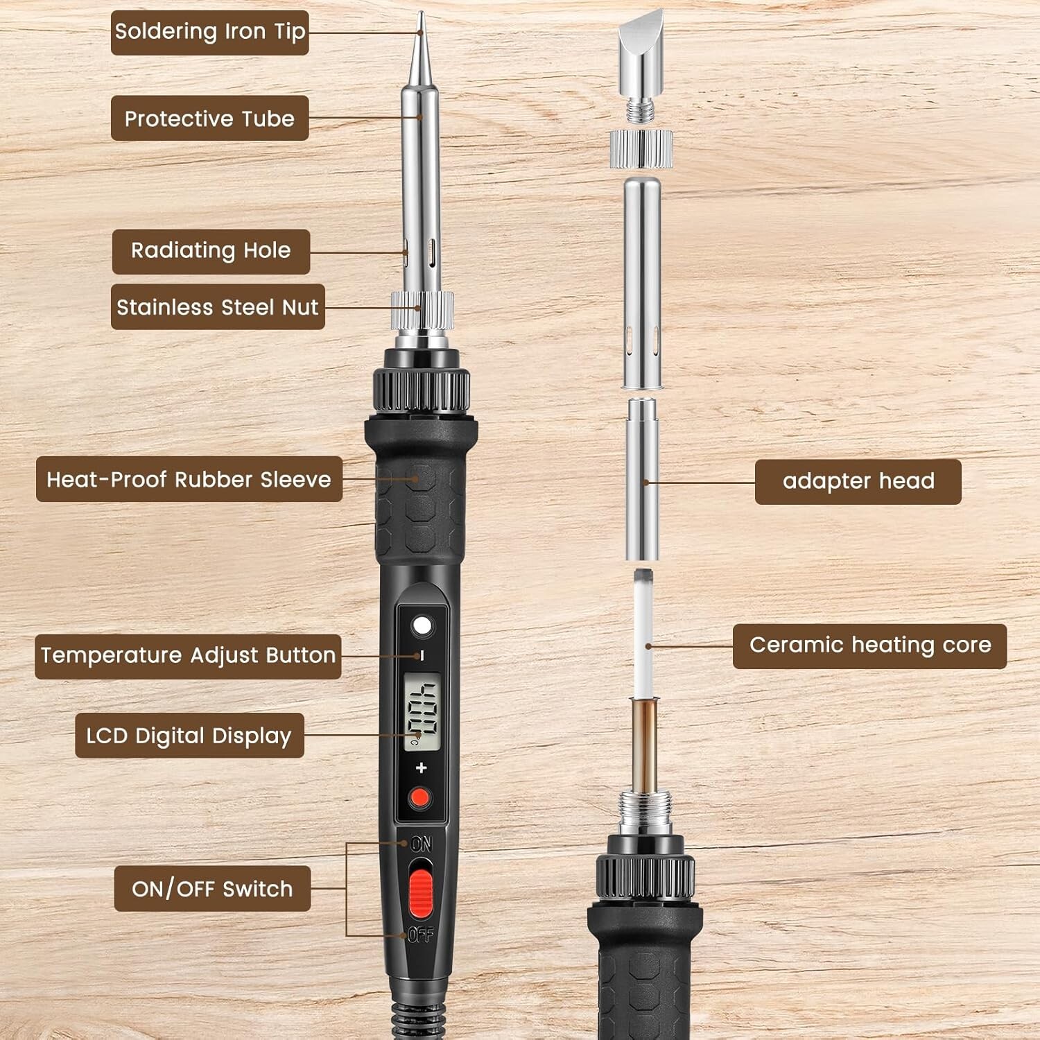 Grâce à un noyau chauffant en céramique de haute qualité, ce fer à souder de **80W** garantit une montée en température ultra-rapide et stable. Sa technologie avancée prolonge sa durée de vie tout en offrant une sensibilité optimale à la température. Passez de **180°C à 480°C** avec une précision de 1°C grâce à son **écran LCD** facile à lire et basculez entre **℃ et ℉** en un clic.