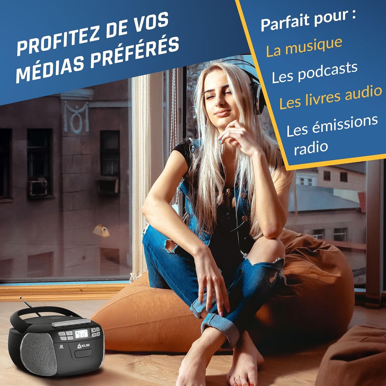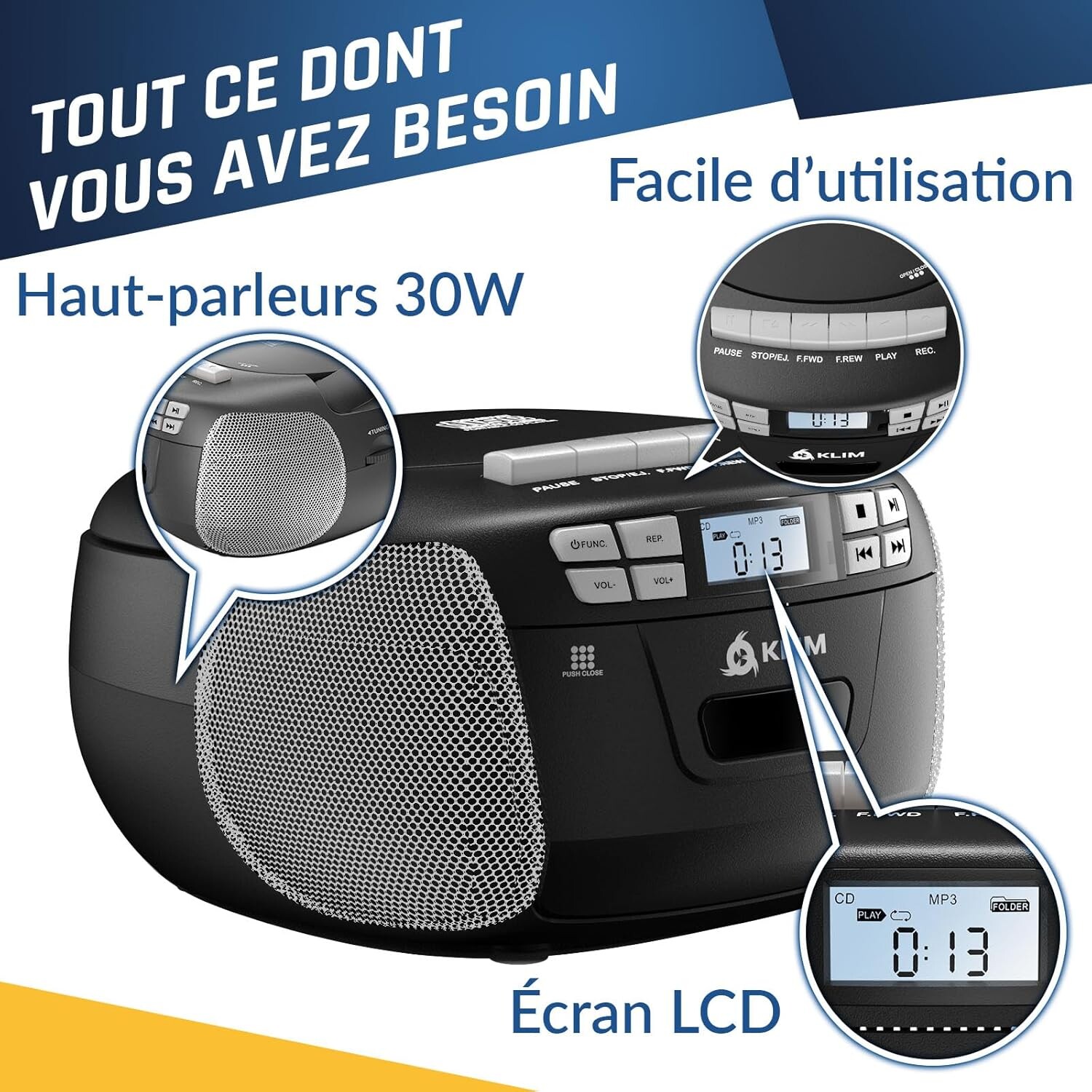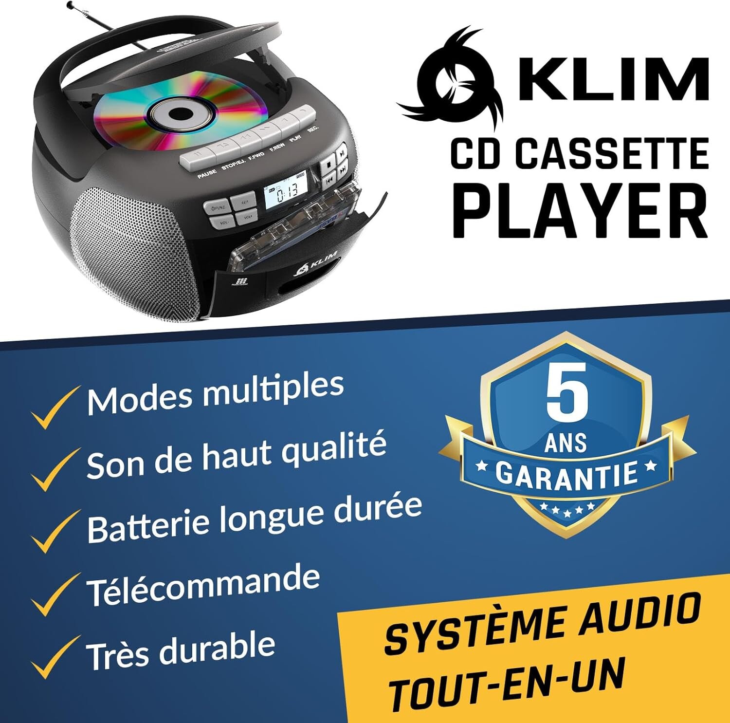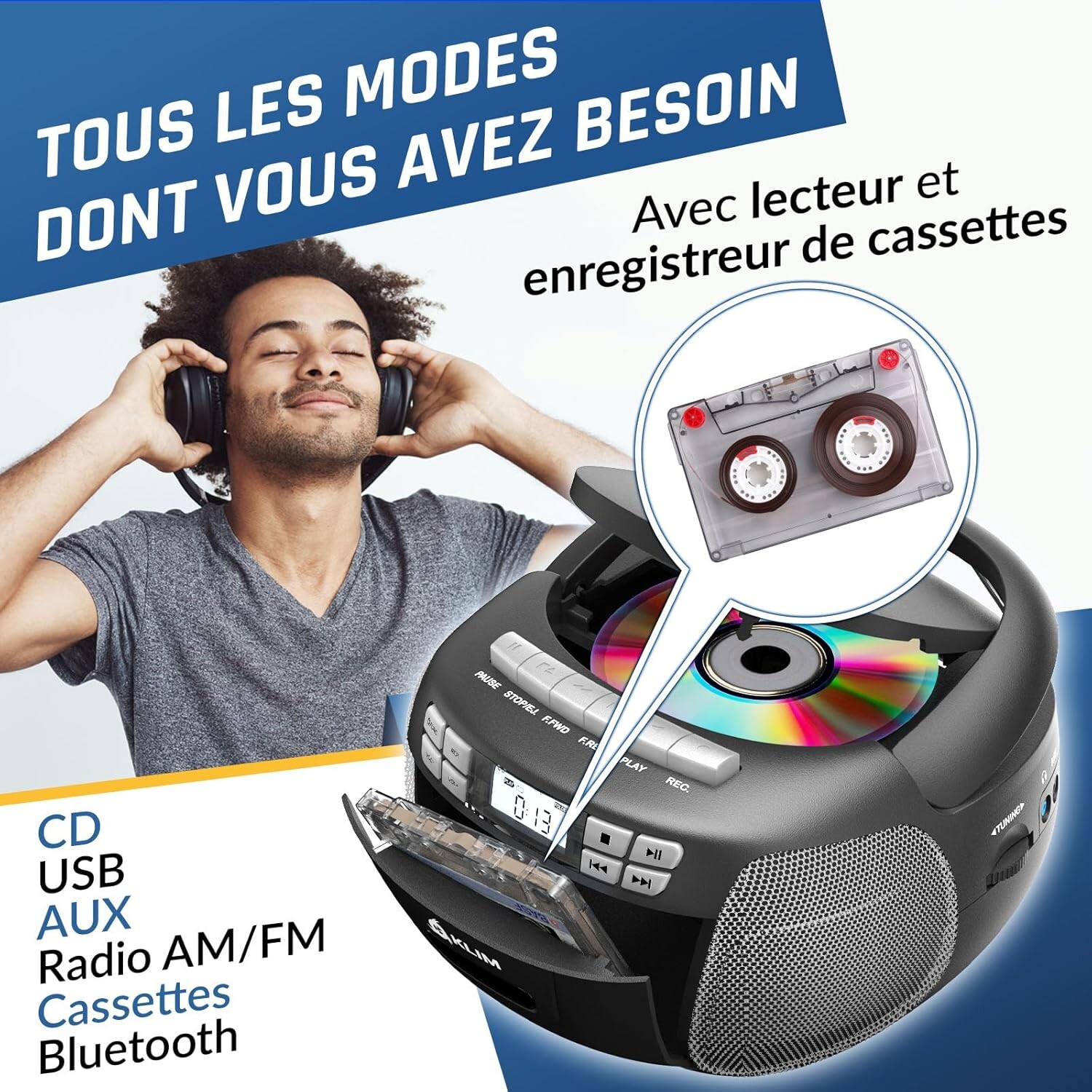 Lecteur CD / Cassette KLIM – Bluetooth, USB, Radio AM/FM – Noir ou Argent