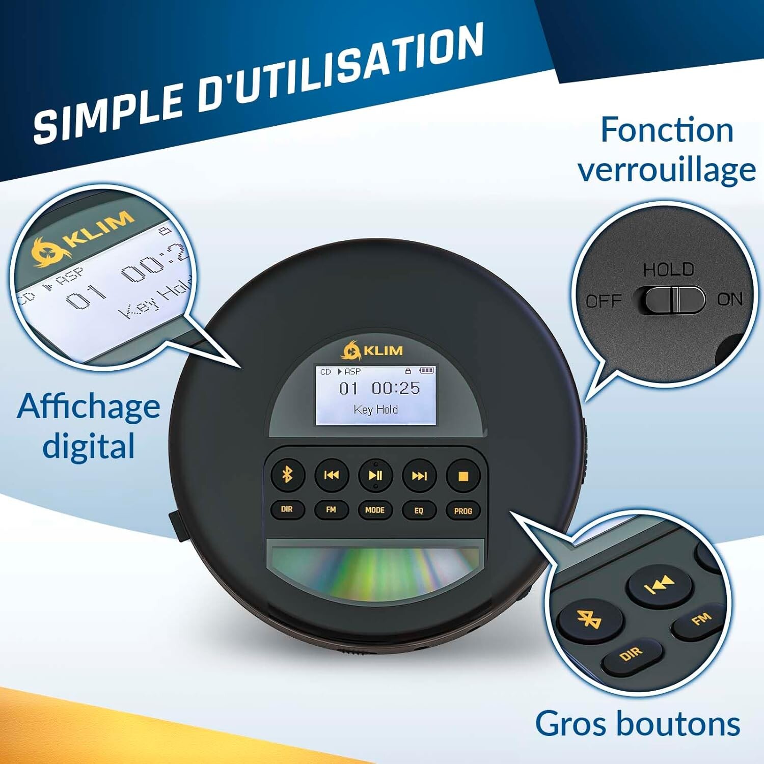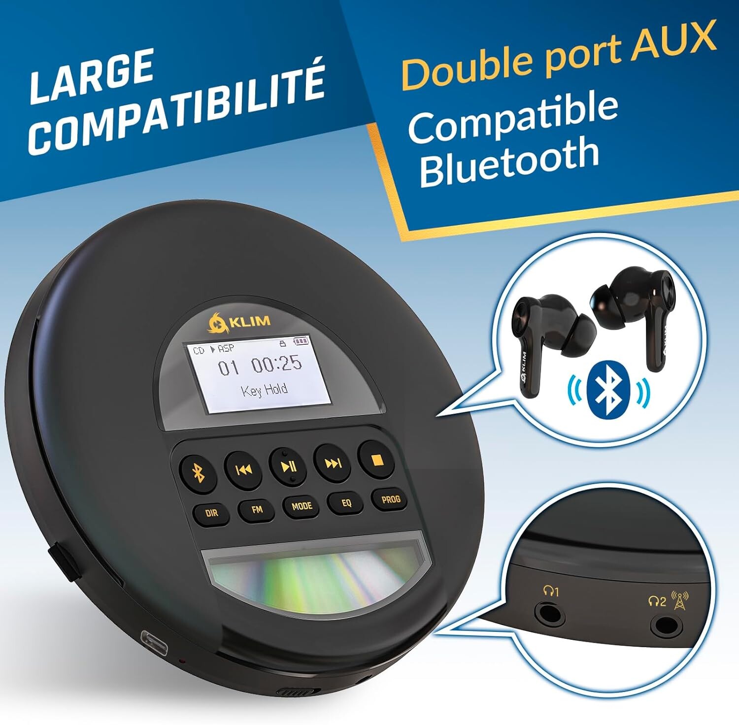 Redécouvrez le plaisir du son CD haute fidélité avec le KLIM Nomad ! Ce lecteur CD portable offre une qualité d'écoute sans compromis grâce aux écouteurs KLIM Fusion inclus, vendus à plus d’un million d’unités. Partagez la musique avec son double port audio, profitez du Bluetooth pour une connexion sans fil avec enceintes ou écouteurs, et écoutez votre station FM favorite. Résistant et fiable, il est équipé de la technologie anti-sauts pour une lecture fluide, même en mouvement. Idéal pour la voiture, le KLIM Nomad se connecte via Bluetooth ou câble AUX. Avec sa batterie rechargeable et sa garantie de 5 ans, c’est l’allié parfait pour les mélomanes en quête de liberté.