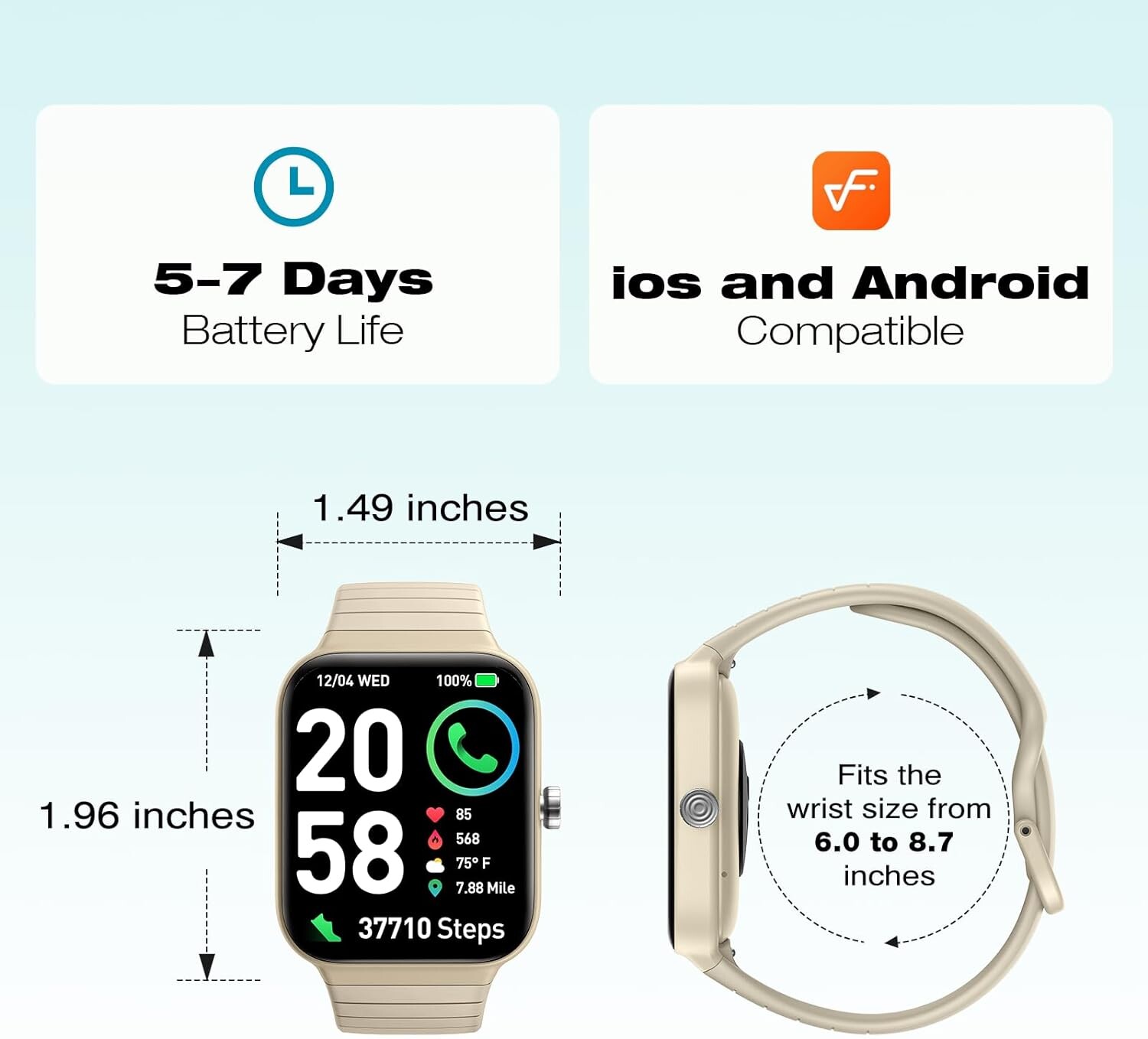 【Autonomie de la batterie de 5 à 7 jours】 Sur une seule charge de 2,5 heures avec la smart watch multifonctionnelle Quican pour homme et femme. Compatible avec les téléphones Android 6.0+ et iOS 9.0+. Contenu de l'emballage : montre connectée, câble de chargement, manuel d'instructions
