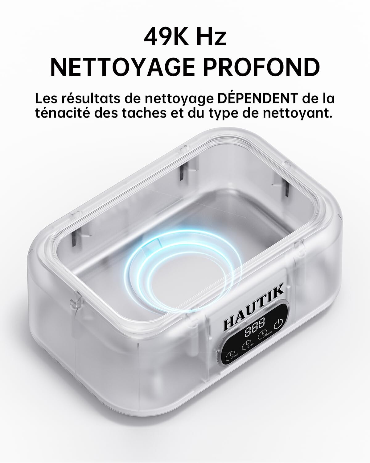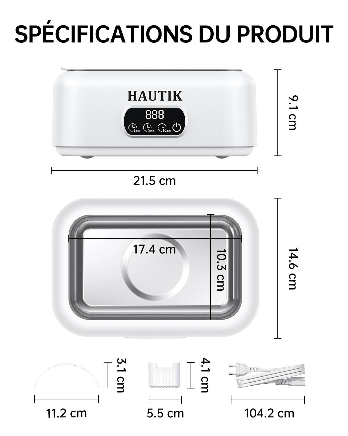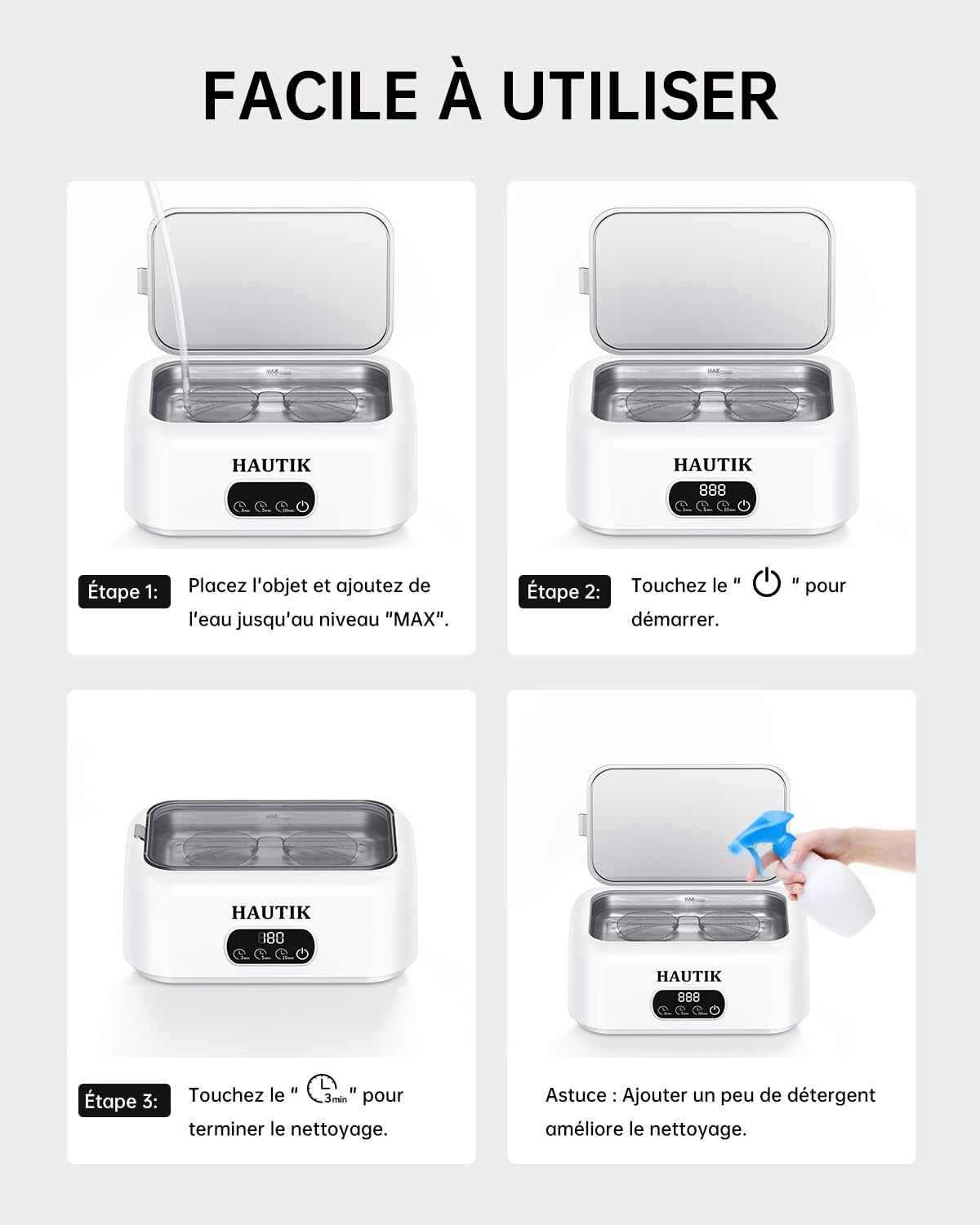 Ce nettoyeur ultrason HAUTIK 700 ml est un véritable atout pour retrouver la brillance de vos lunettes, bijoux, et montres en toute simplicité