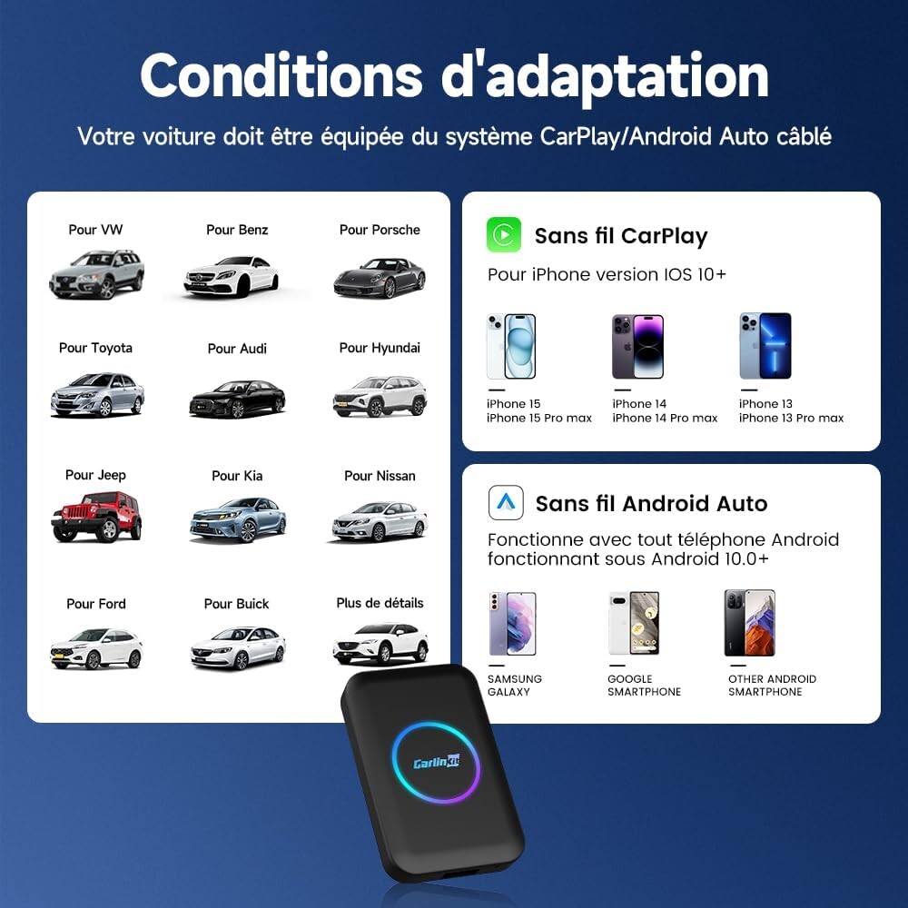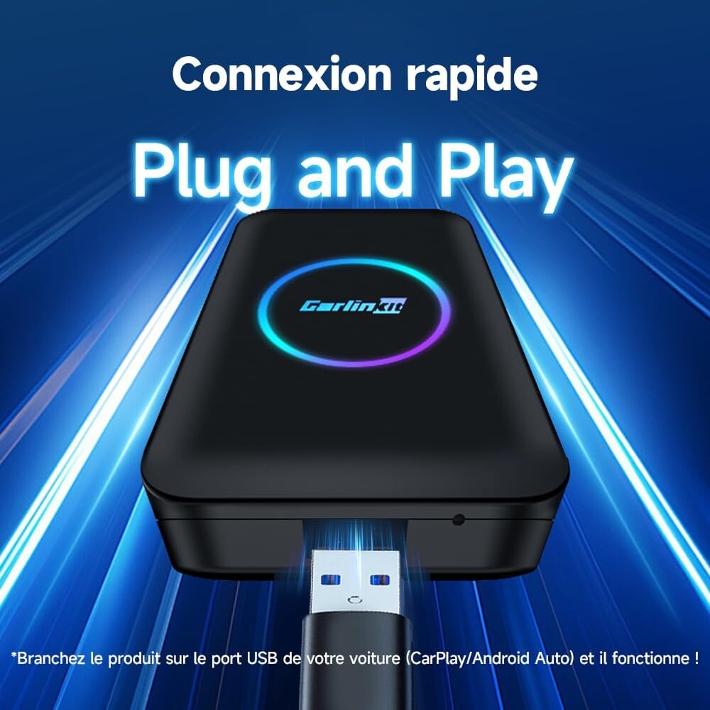 Le produit **Tbox-Lite** permet de transformer CarPlay filaire et Android Auto filaire en versions sans fil, tout en offrant un accès facile à des plateformes de streaming comme YouTube et Netflix. Facile à installer grâce à la fonctionnalité "Plug and Play", il n'est pas nécessaire de modifier l'équipement d'origine de la voiture. Ce dispositif est équipé d'une puce haute performance pour un fonctionnement fluide et stable. Il est compatible avec divers modèles de smartphones, tant iPhone qu'Android. Enfin, le produit est soutenu par un service client réactif et des mises à jour logicielles régulières.