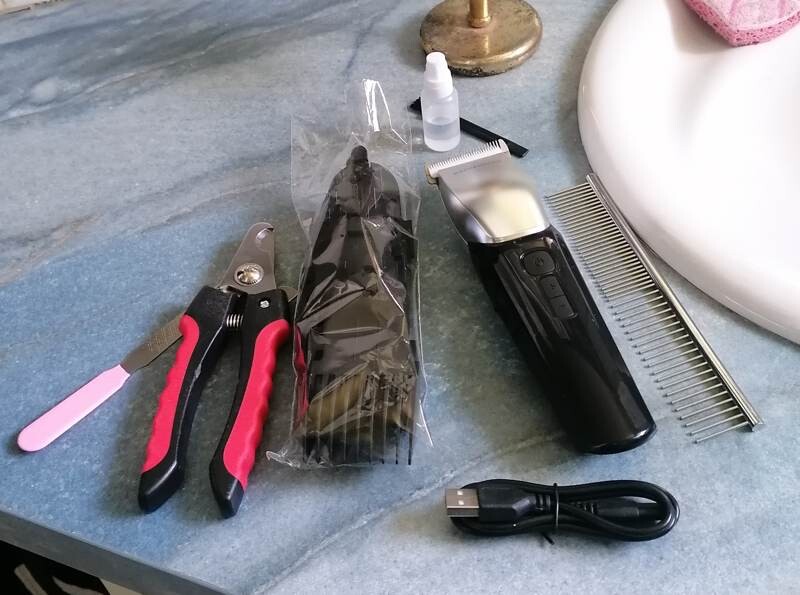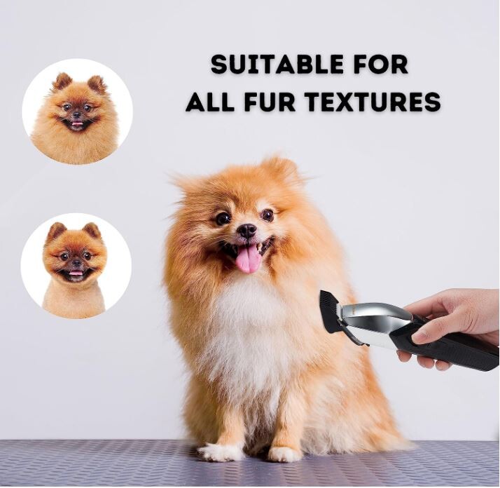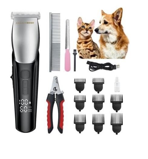 Tondeuse de toilettage tout-en-un pour animaux de compagnie. C'est une tondeuse de toilettage qui comprend tout ce dont vous avez besoin pour toiletter votre chien et/ou votre chat bien-aimé avec 8 accessoires de peigne, 4 réglages de vitesse, coupe-ongles et lime à ongles afin de lisser les bords rugueux.