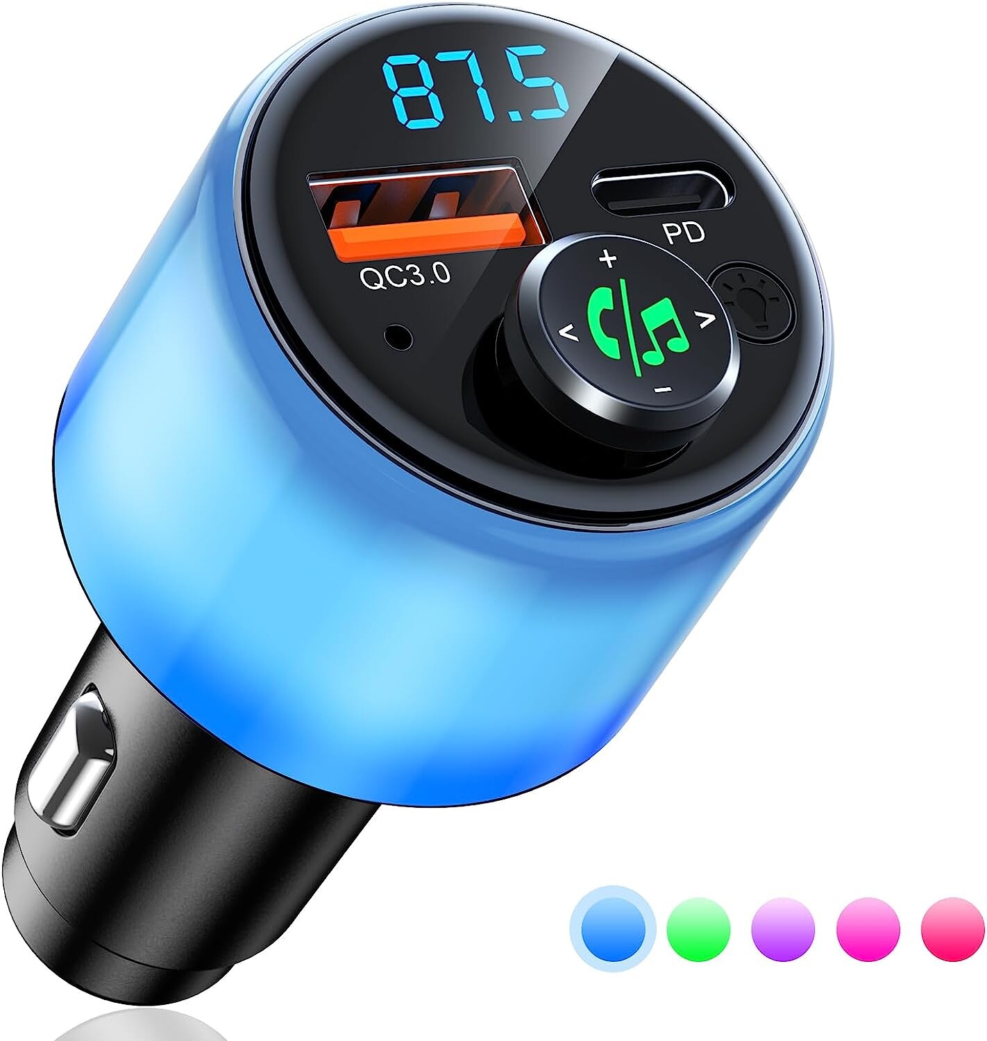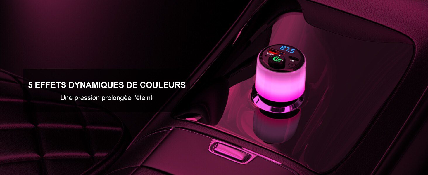 [Lumière Ambiante Dynamique] Le transmetteur FM Bluetooth pour voitures est équipé d'un éclairage intégral dynamique avec cinq couleurs vives qui passent automatiquement en mode respiration lors de la lecture de musique, pour créer une atmosphère immersive et apaisante dans votre véhicule.
