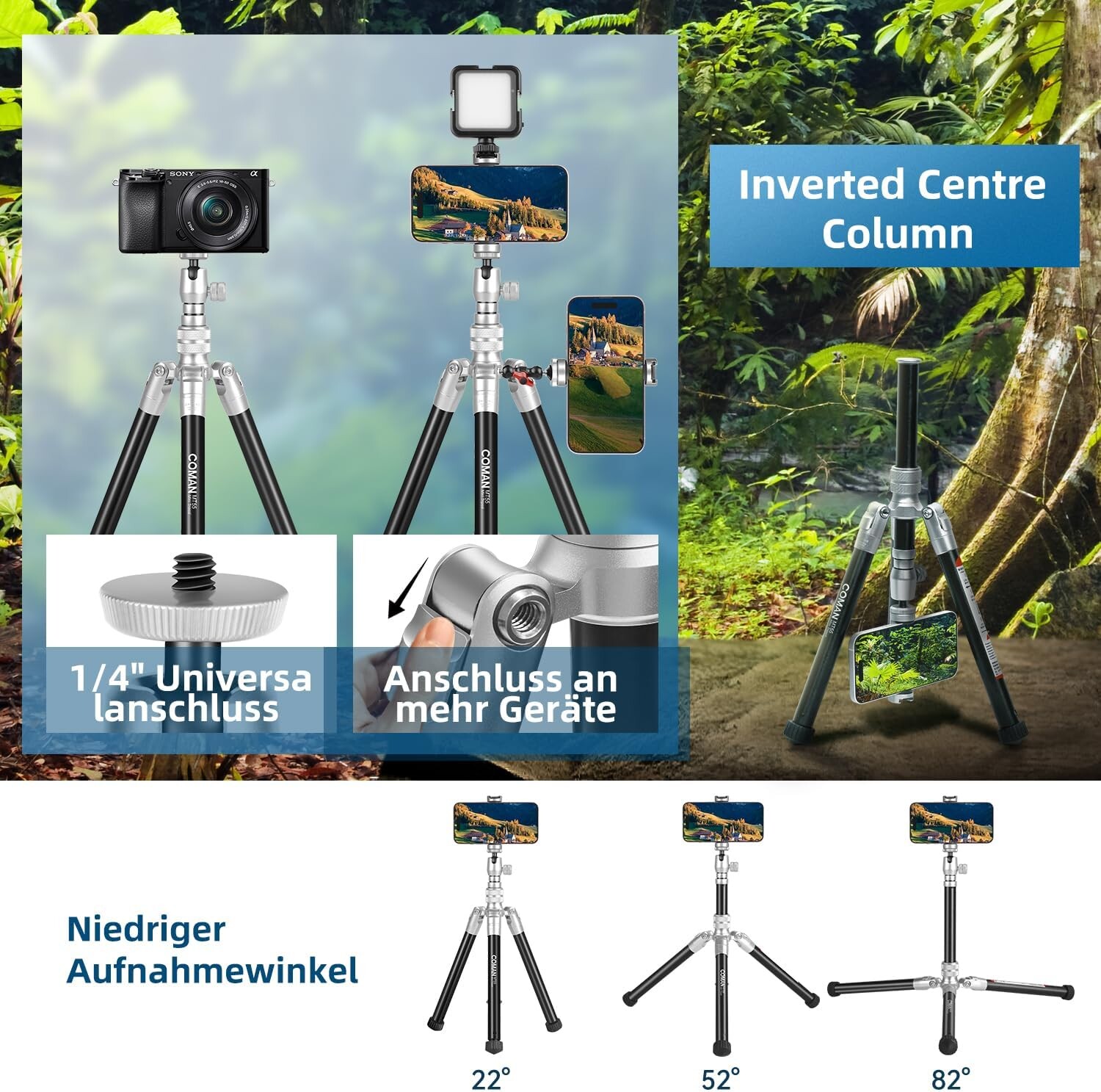Avec sa polyvalence exceptionnelle, sa compatibilité étendue, sa portabilité et ses fonctionnalités de prise de vue flexibles, le trépied monopode-selfie stick COMAN 3 en 1 est un outil indispensable pour les photographes et vidéastes amateurs et professionnels. Prêt à répondre à tous vos besoins de capture, il vous accompagnera partout où vous irez.